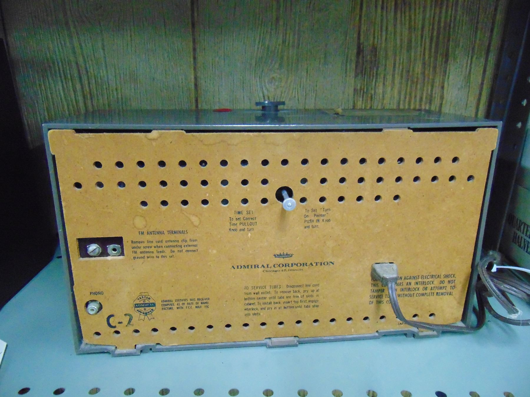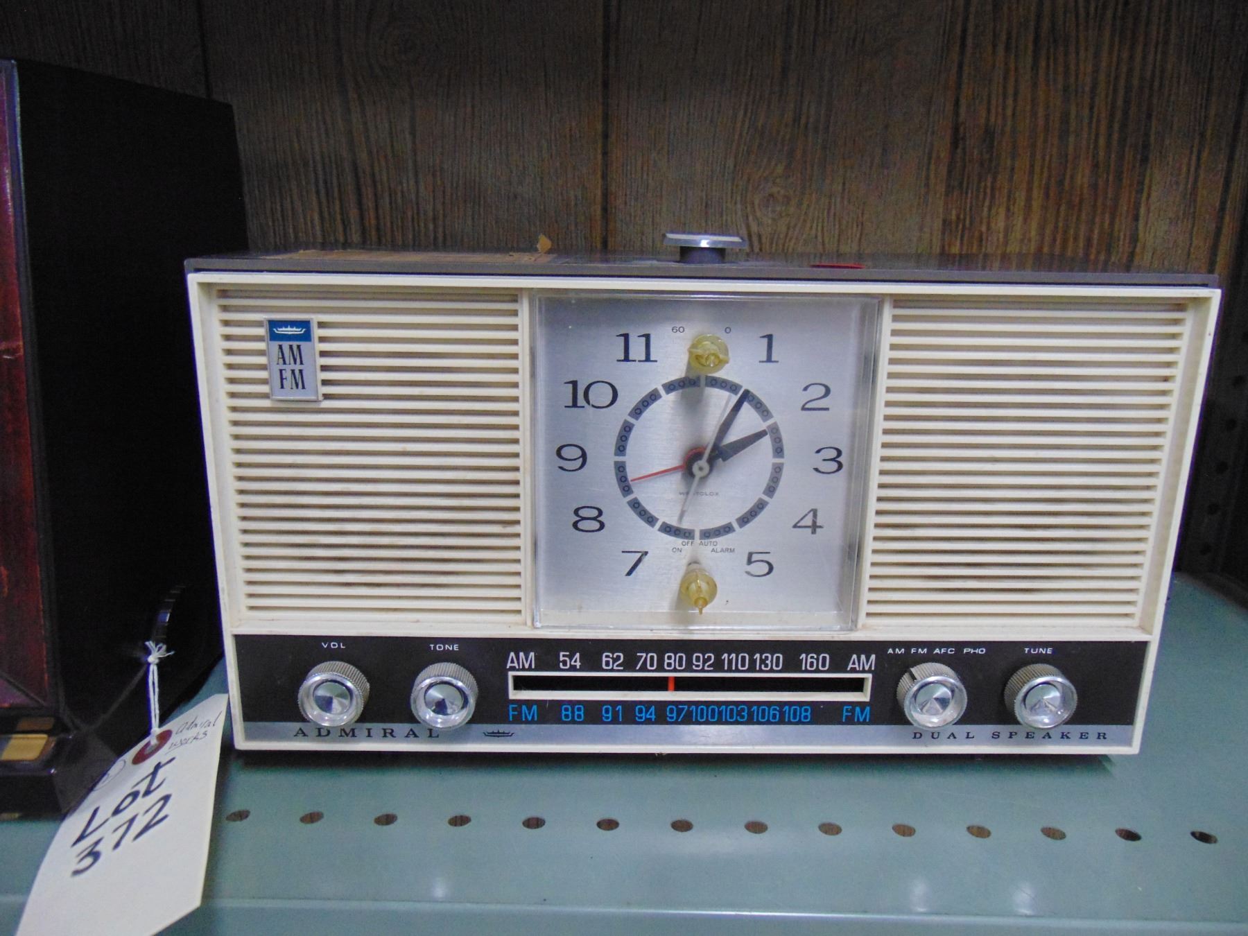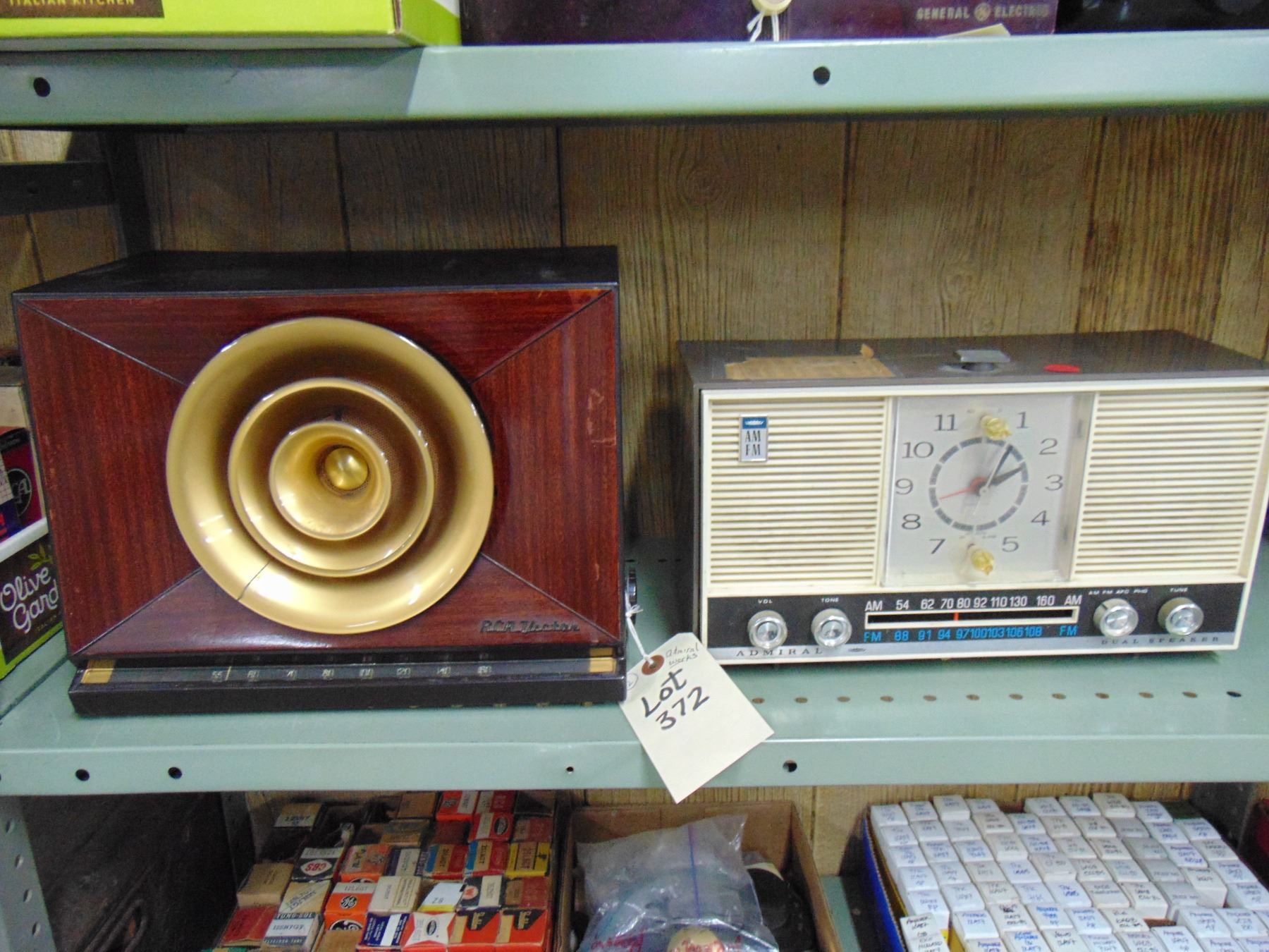 2 radios - RCA Victor bakelite set, model 9-X-57, crack on speaker grill; includes replacement grill; also Admiral clock radio, model YHC627, am/fm, no cracks, works
