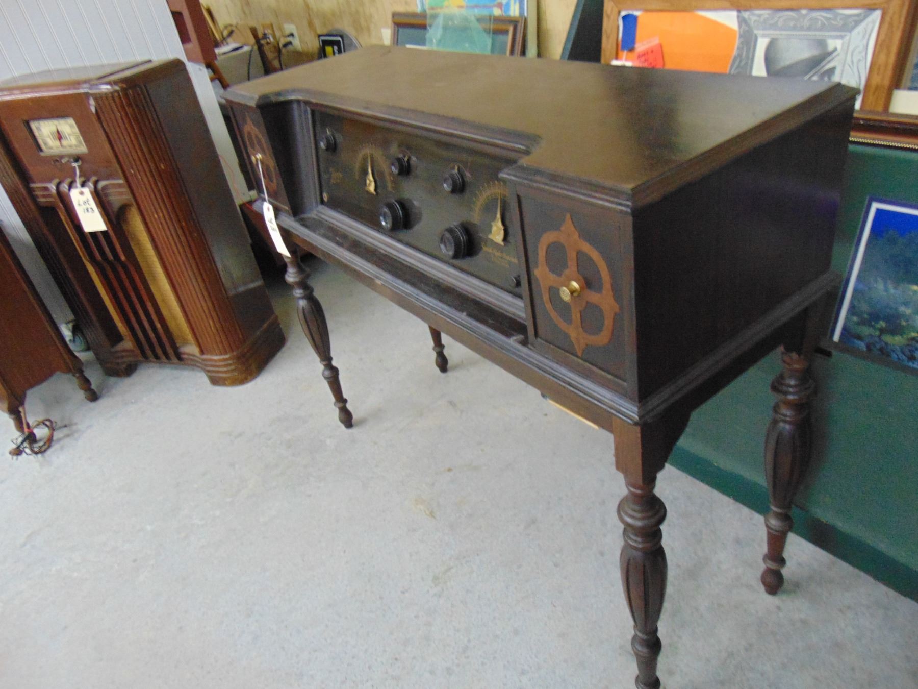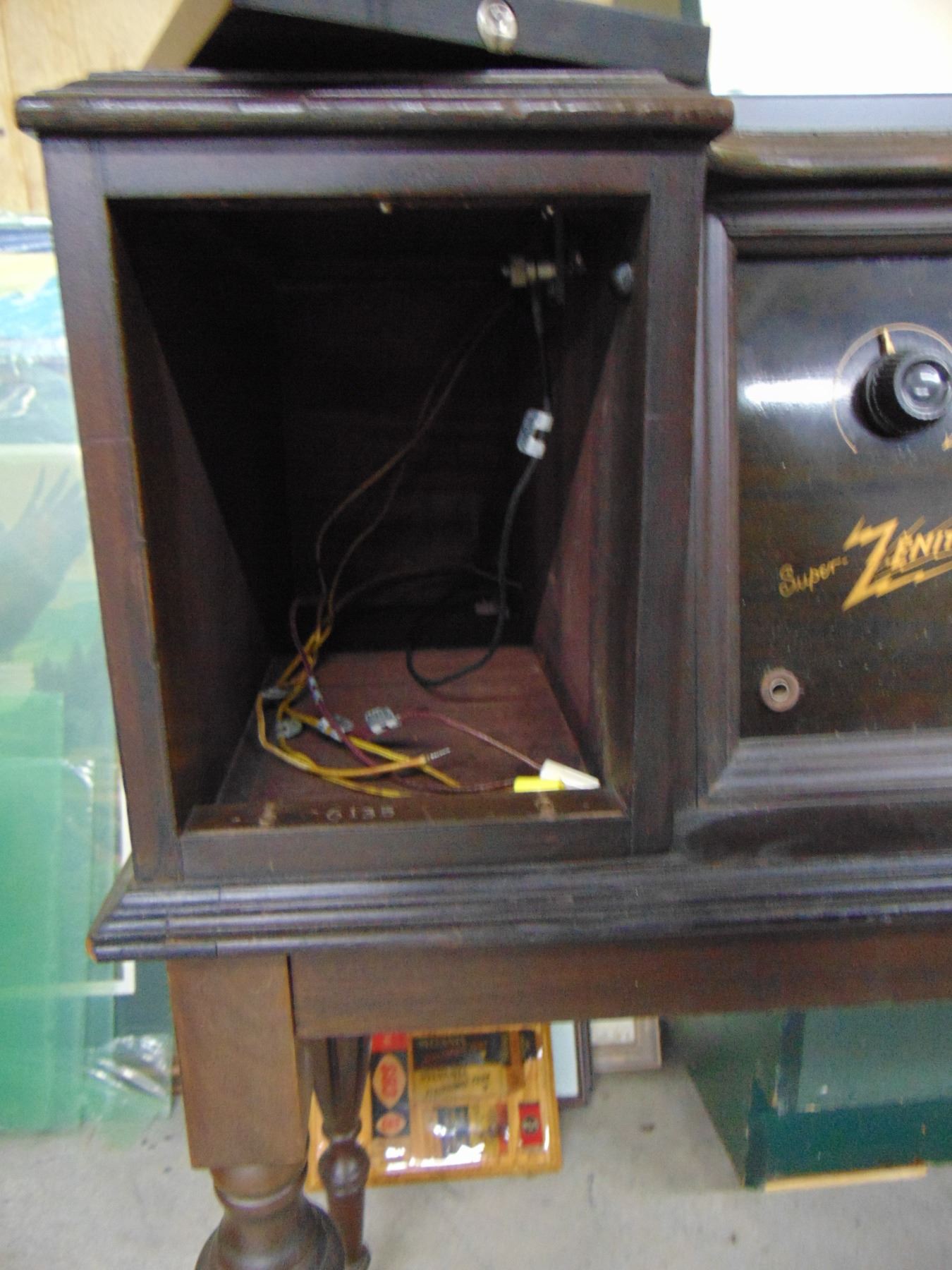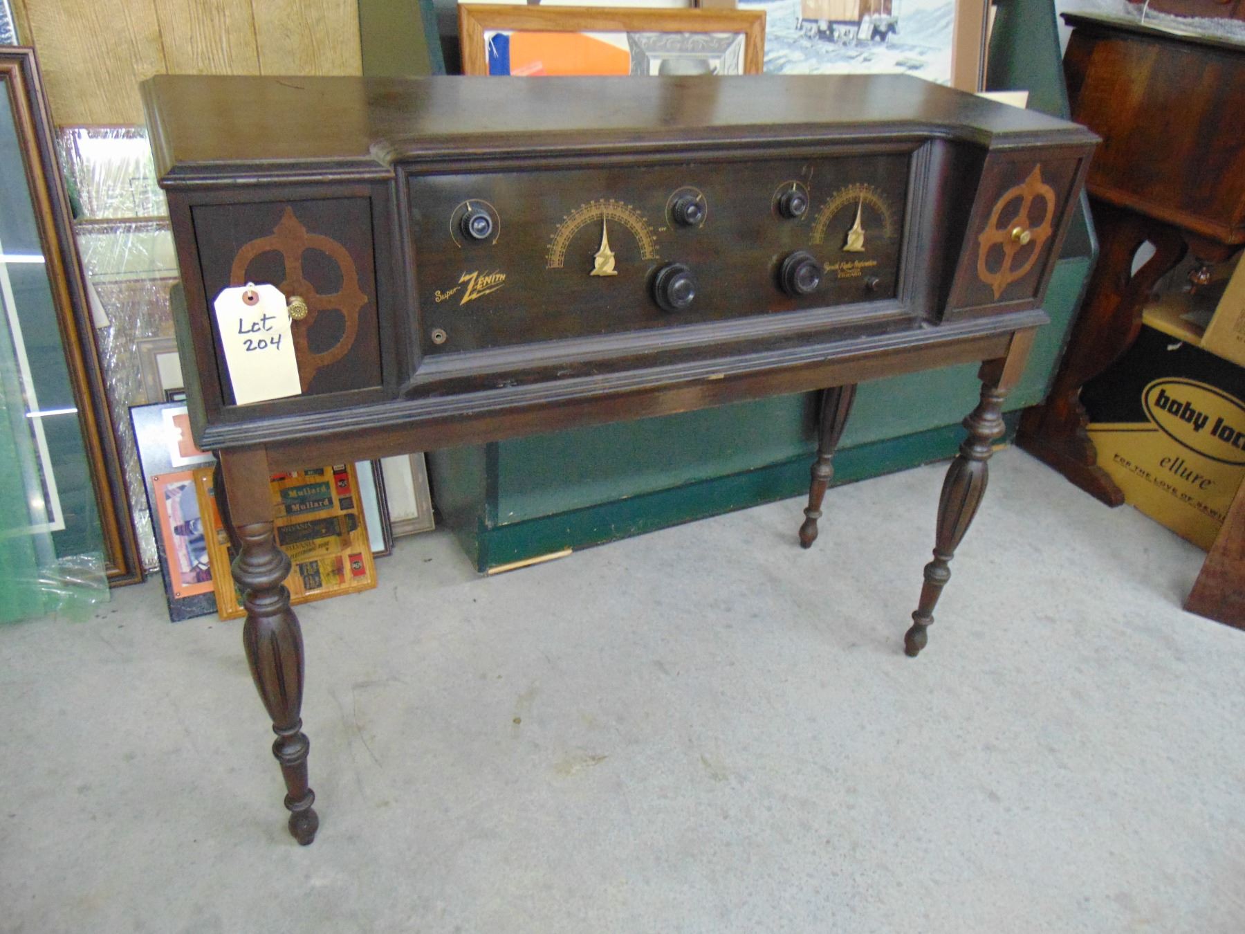 Super Zenith console; model 7; nice; with built in power supply, tubes; includes RARE original radio table; works