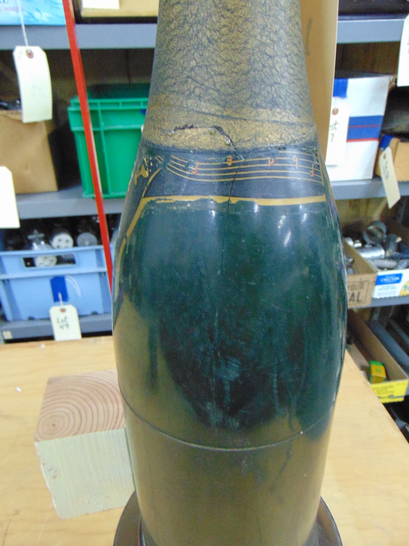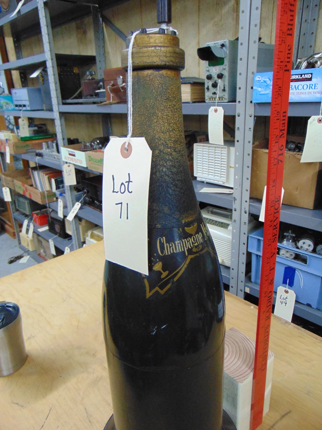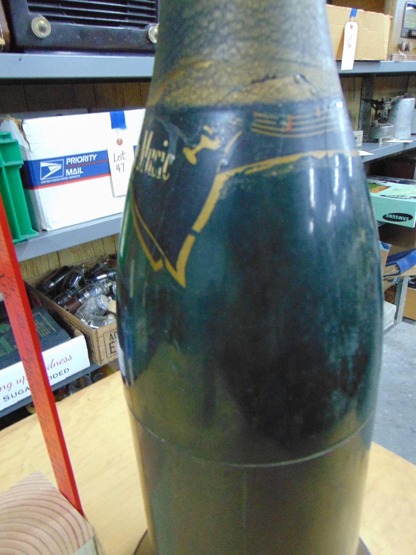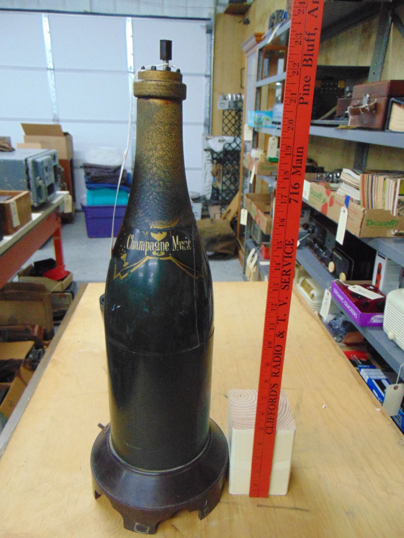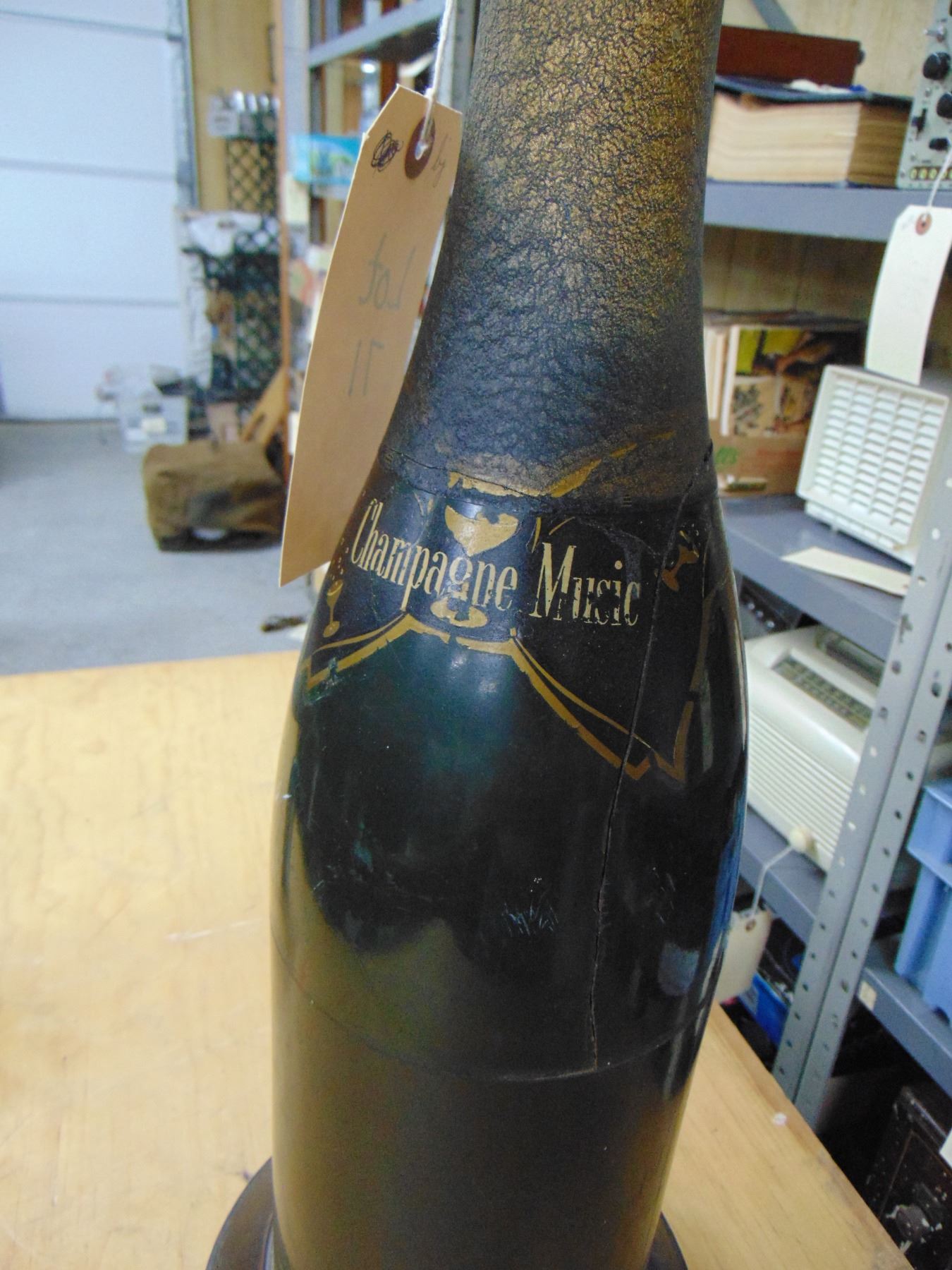 Large "Champagne Music" bottle radio; some cabinet damage; poor repair job; missing tuning knob