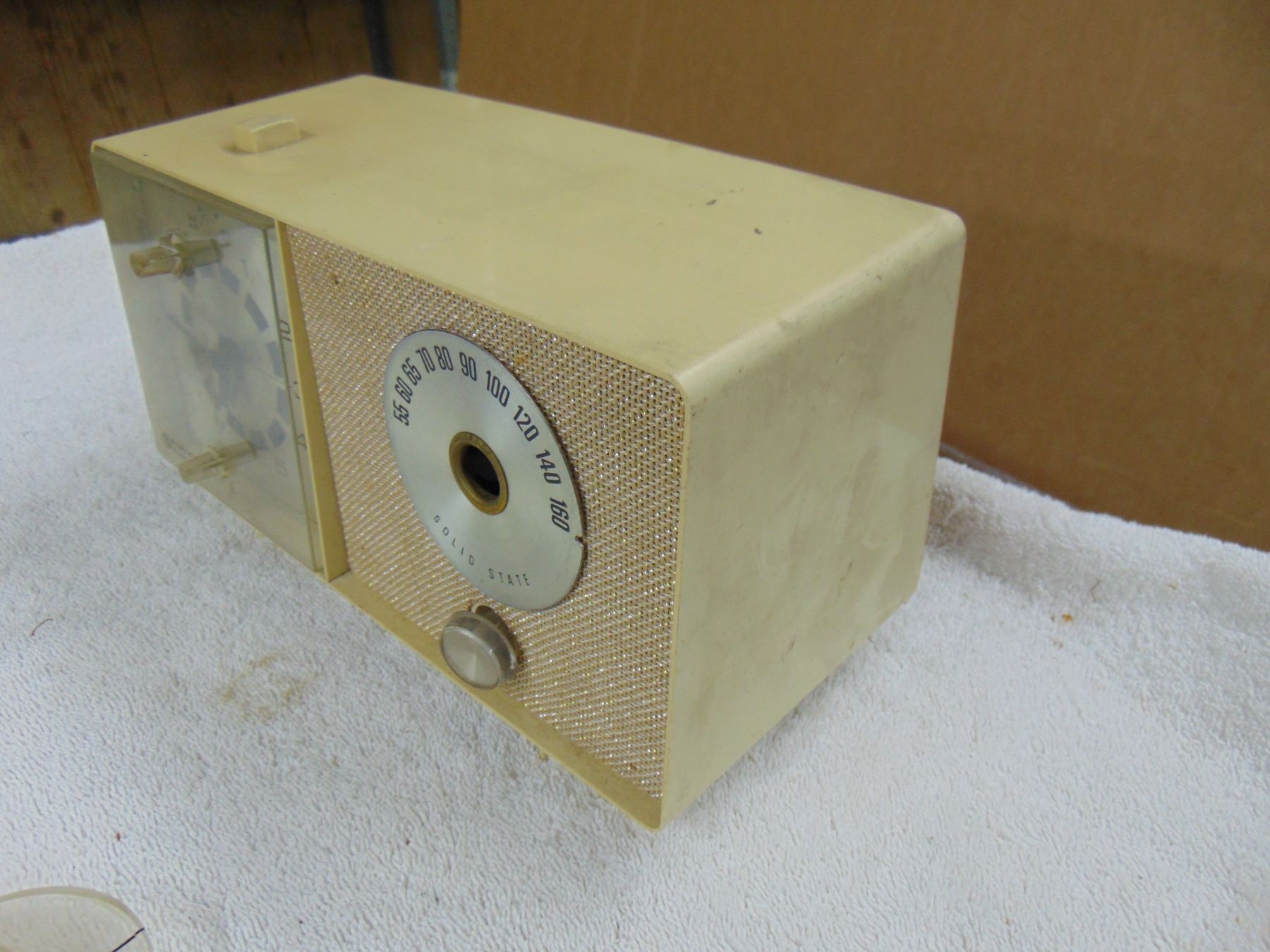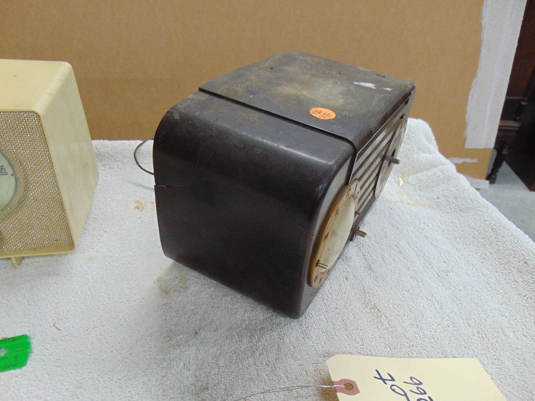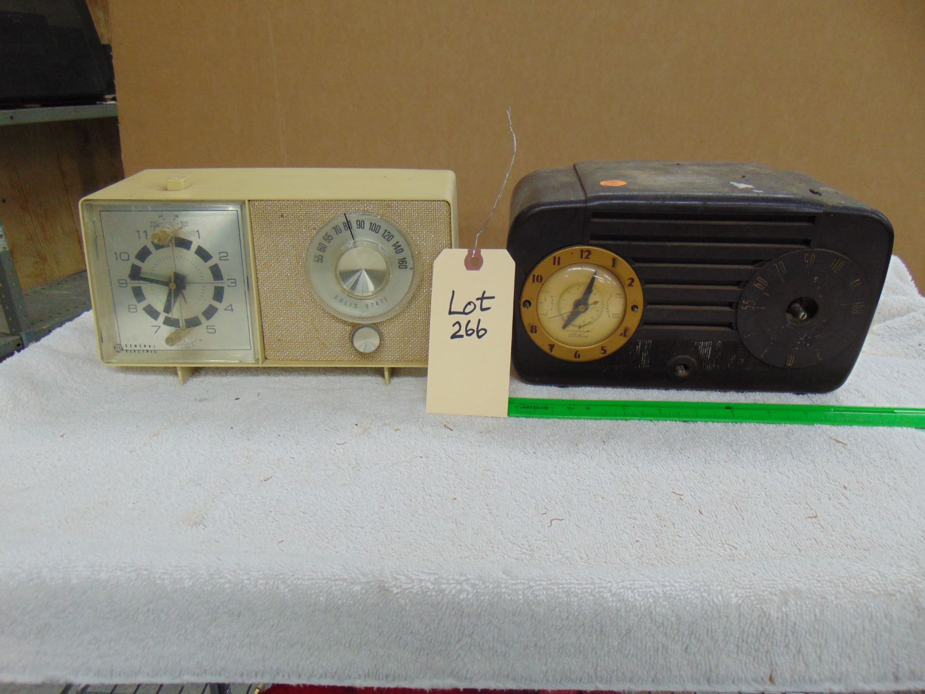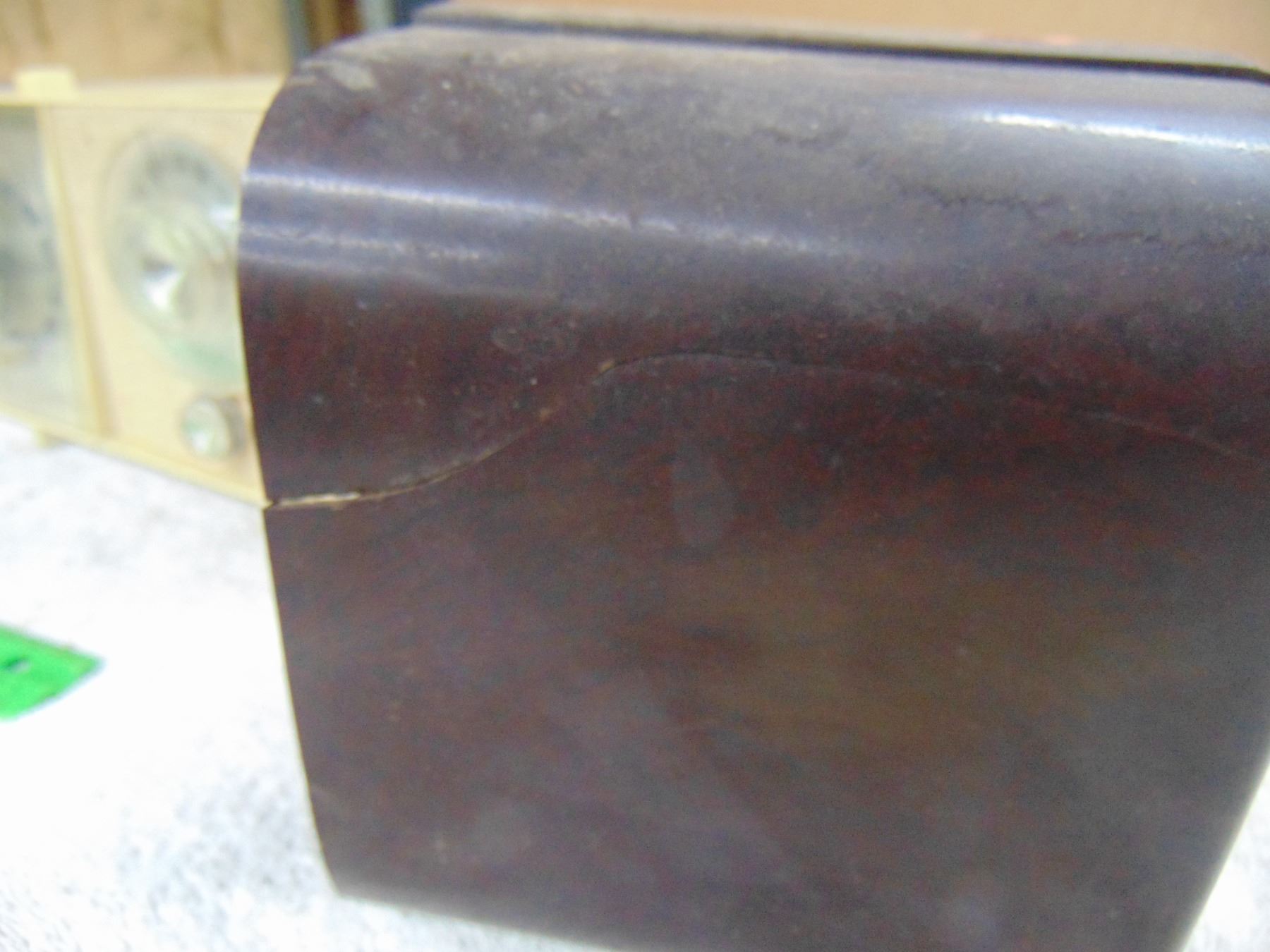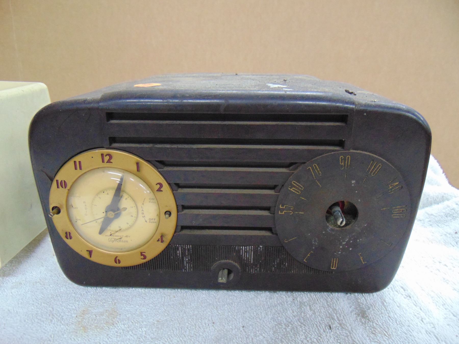 General Electric clock radio; crack on side; ALSO, brown bakelite clock radio