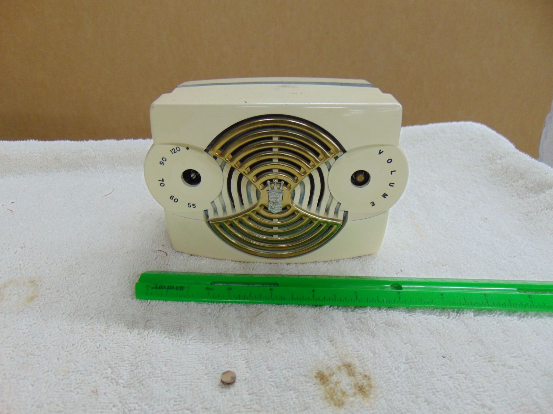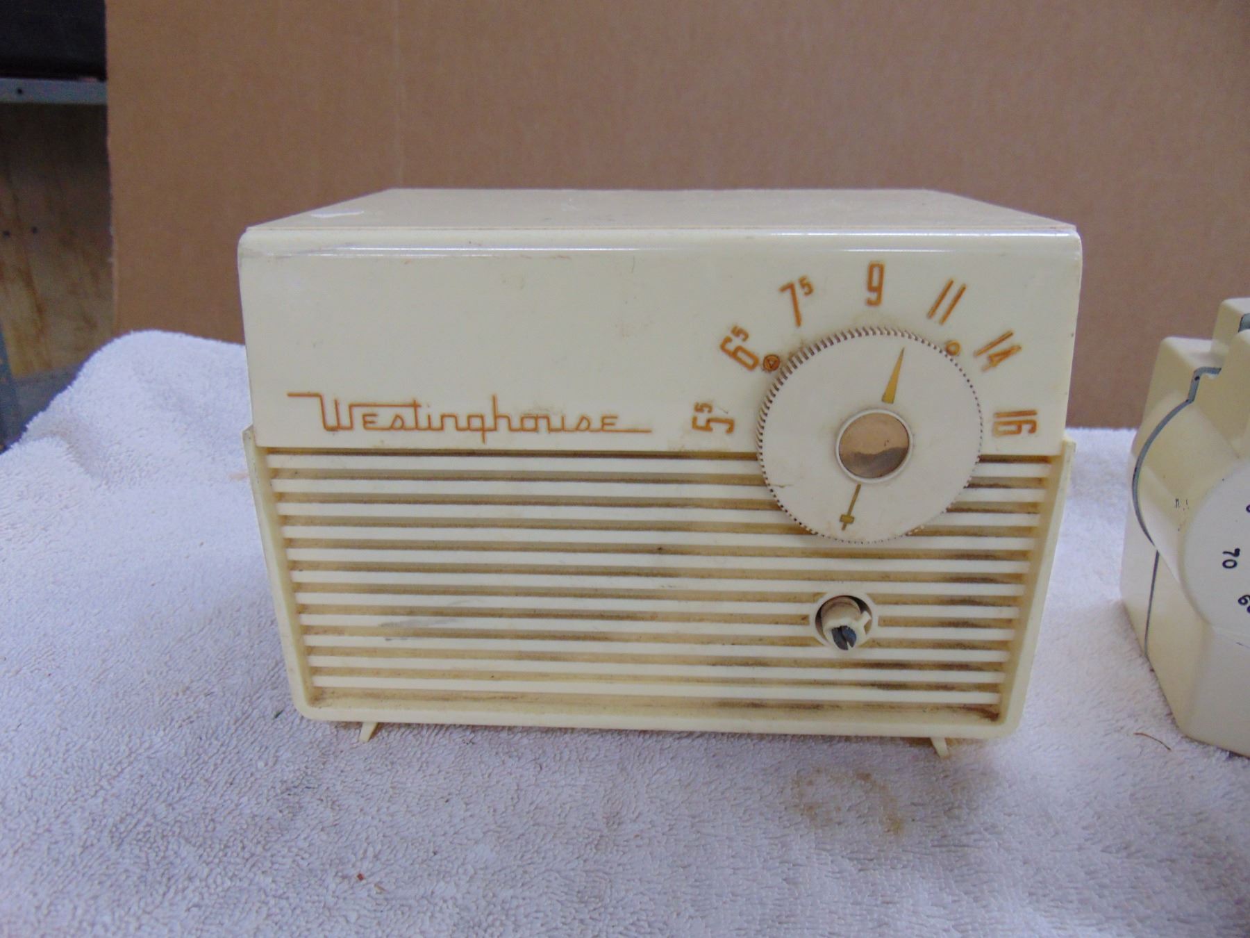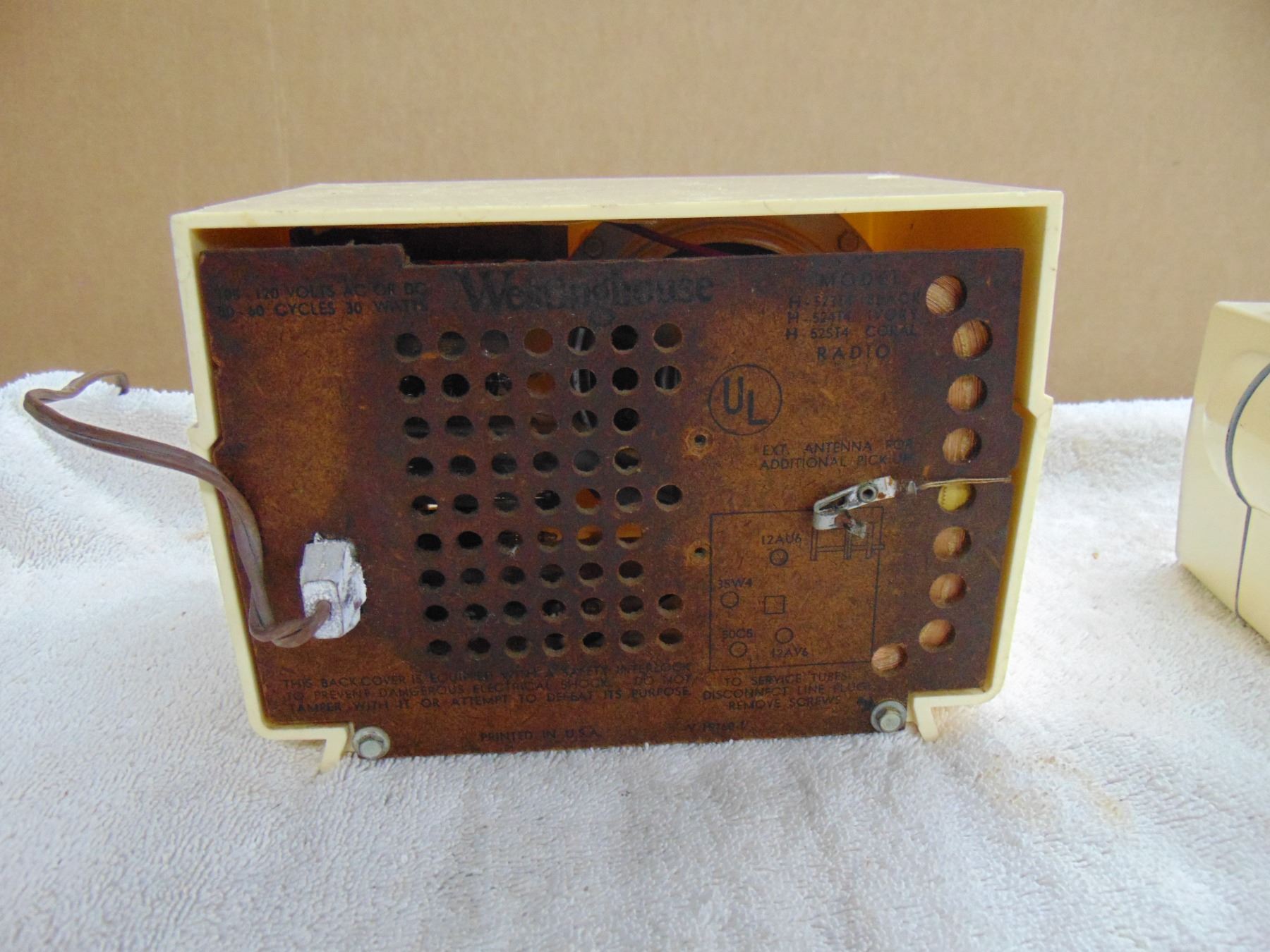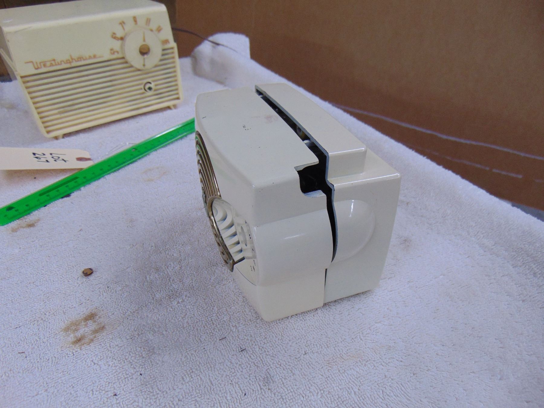 Westinghouse white bakelite table set, model H-524T4, missing knob, no cracks; ALSO, Zenith owl white radio, no cracks, good for parts or restoration