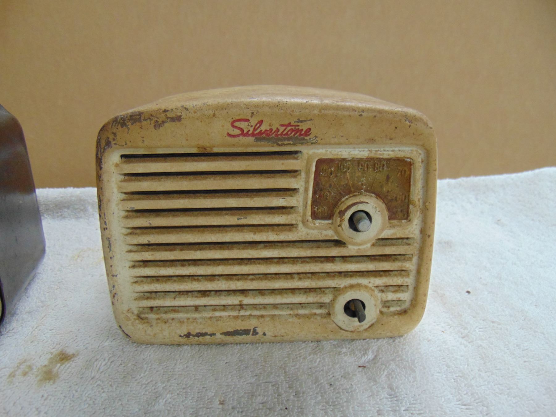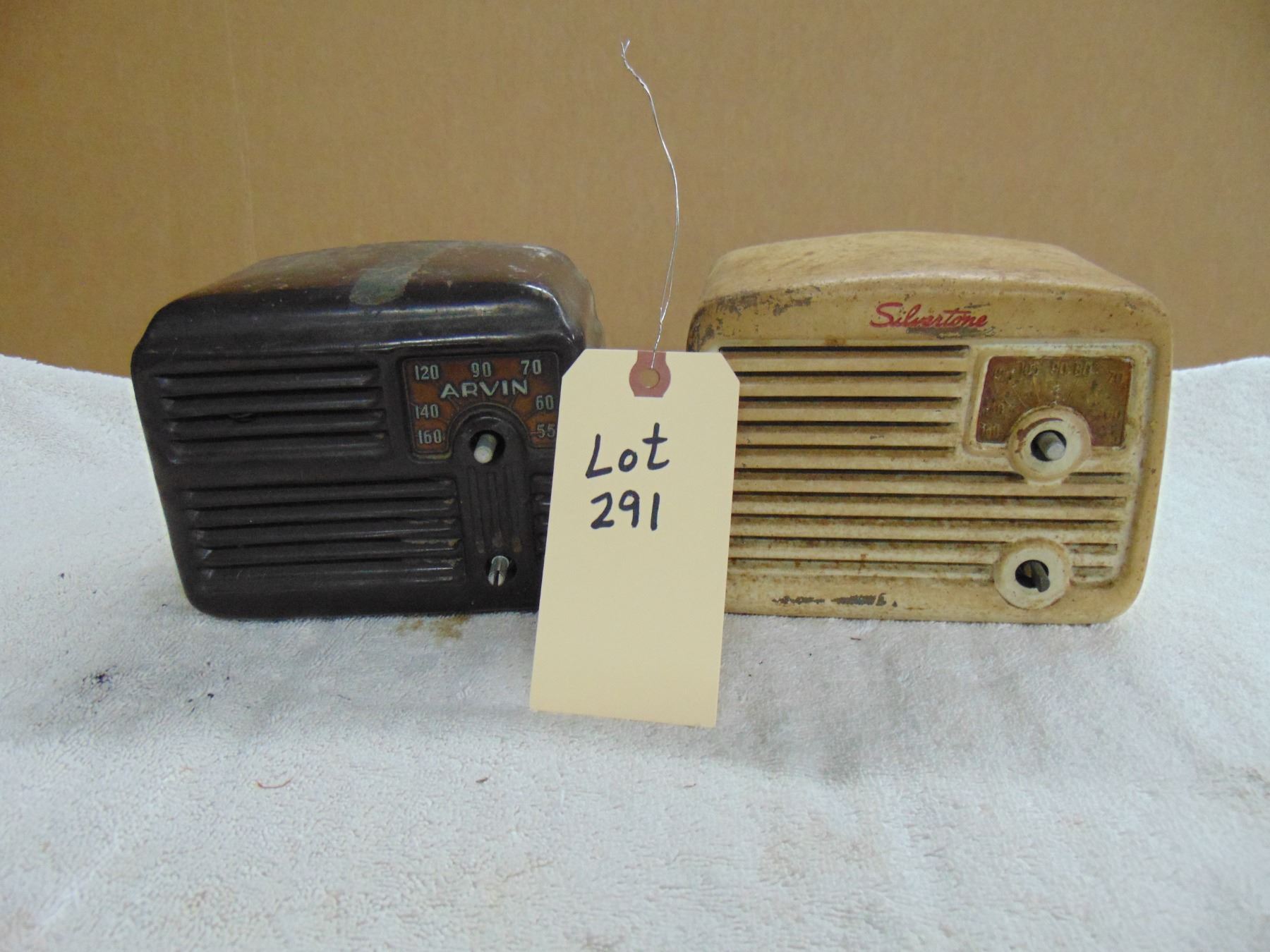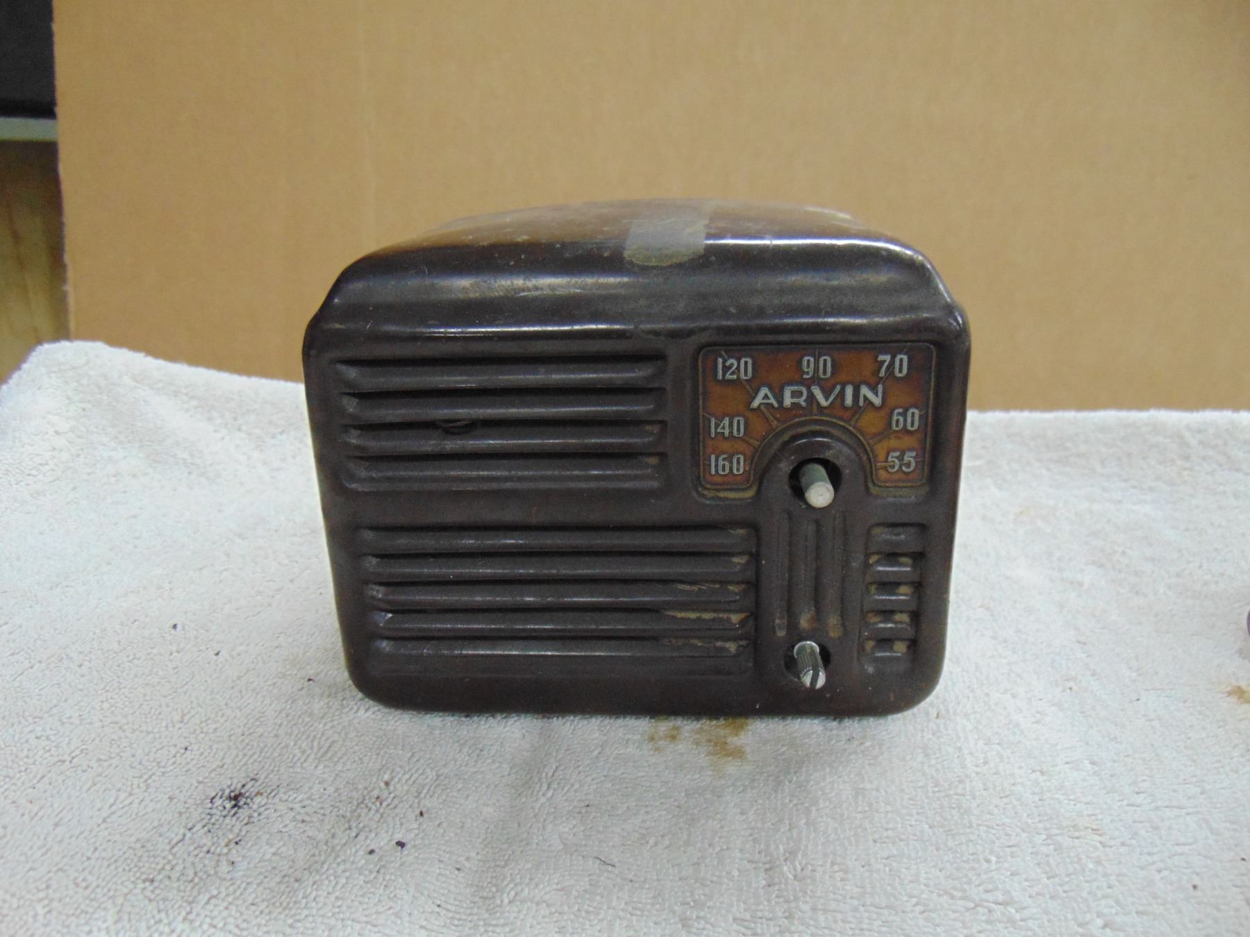 Brown metal Arvin, with back, model 424; ALSO, Silvertone metal set, original back