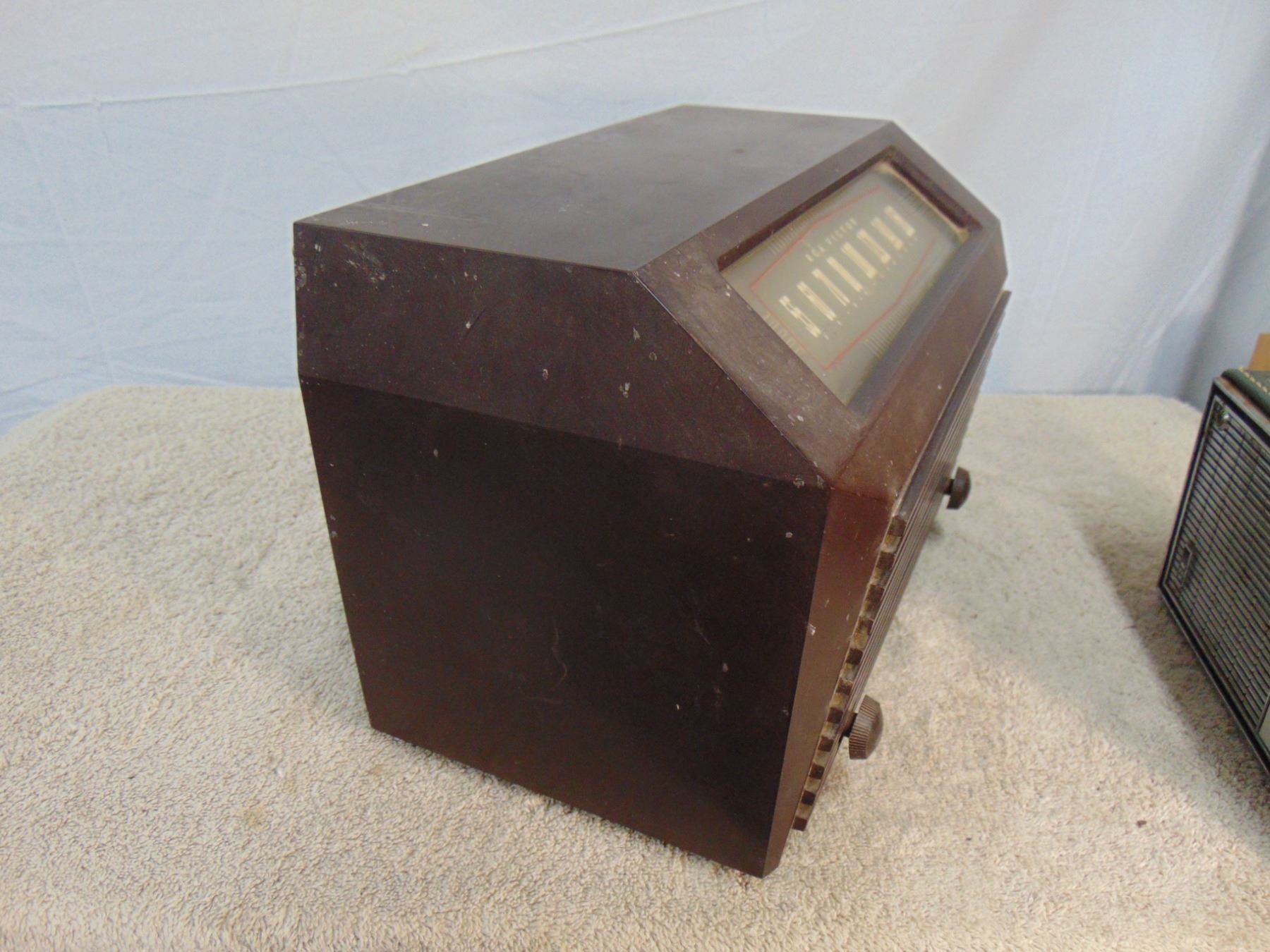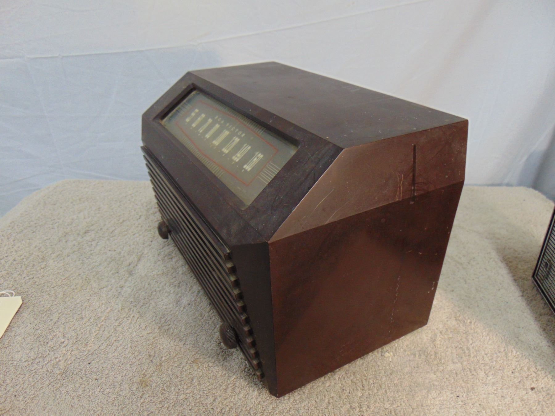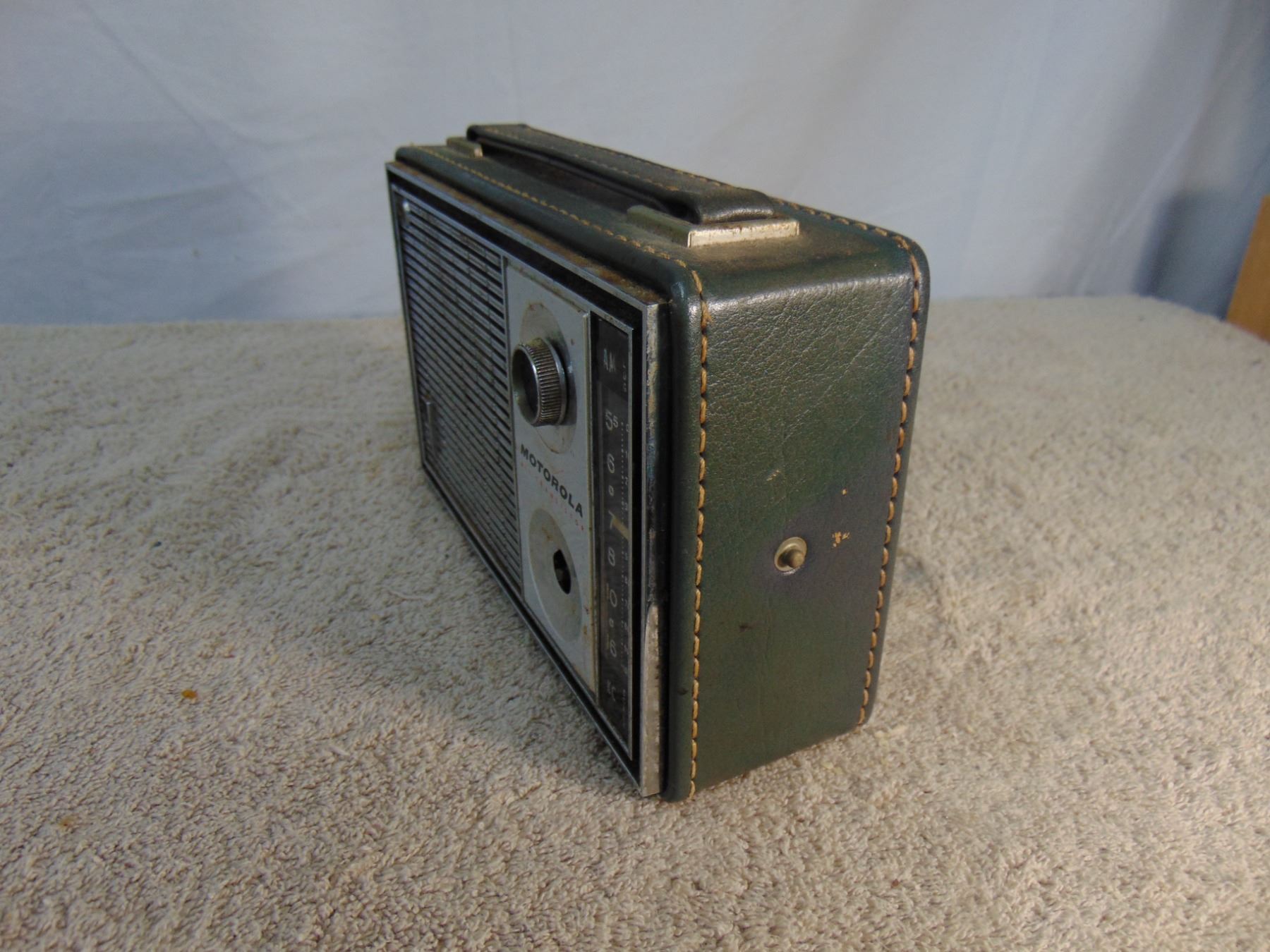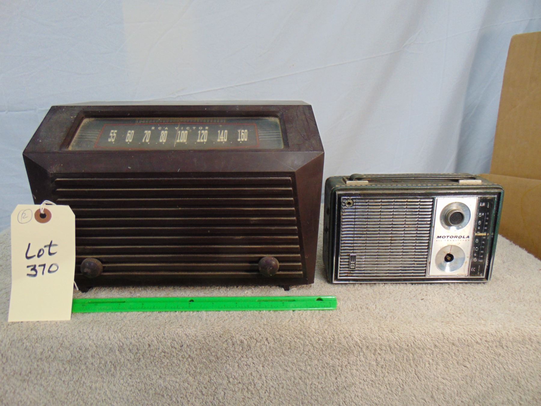 Two items: 1) RCA brown bakelite table set, model 9X641, original back, no cracks; 2) Motorola portable, model X31A-1, leather case, missing 1 knob, nice condition