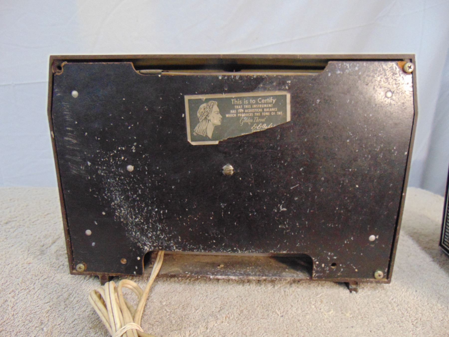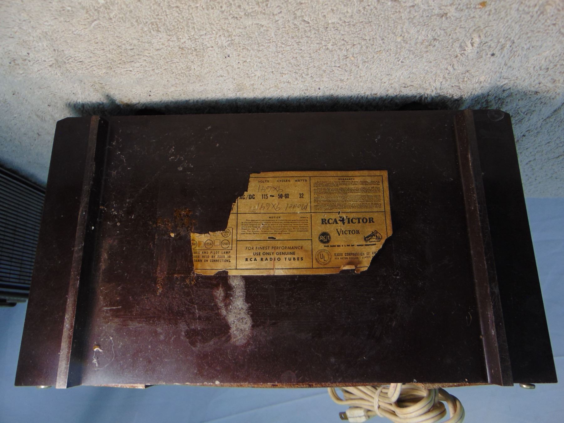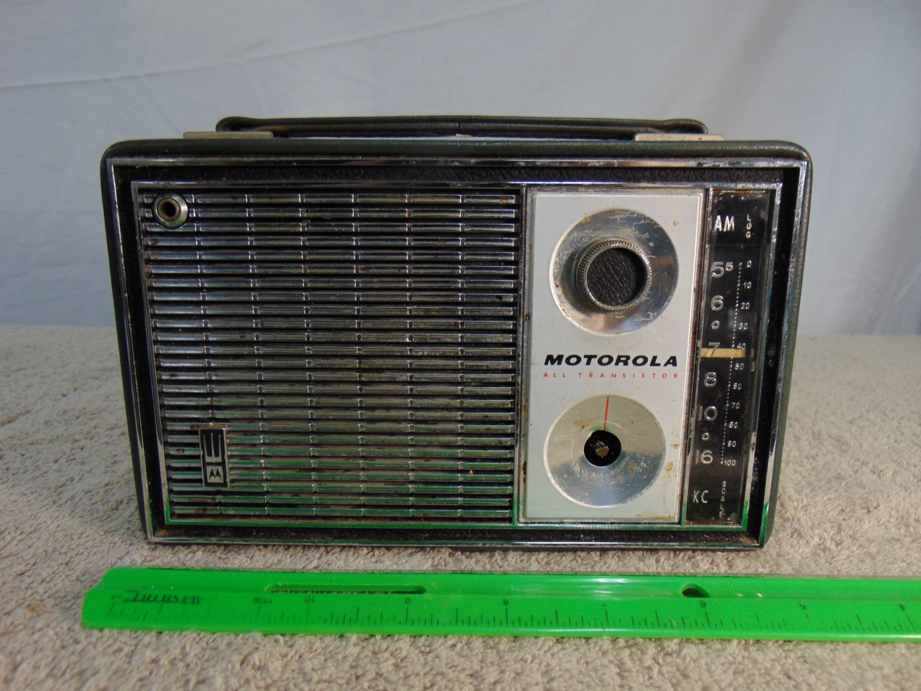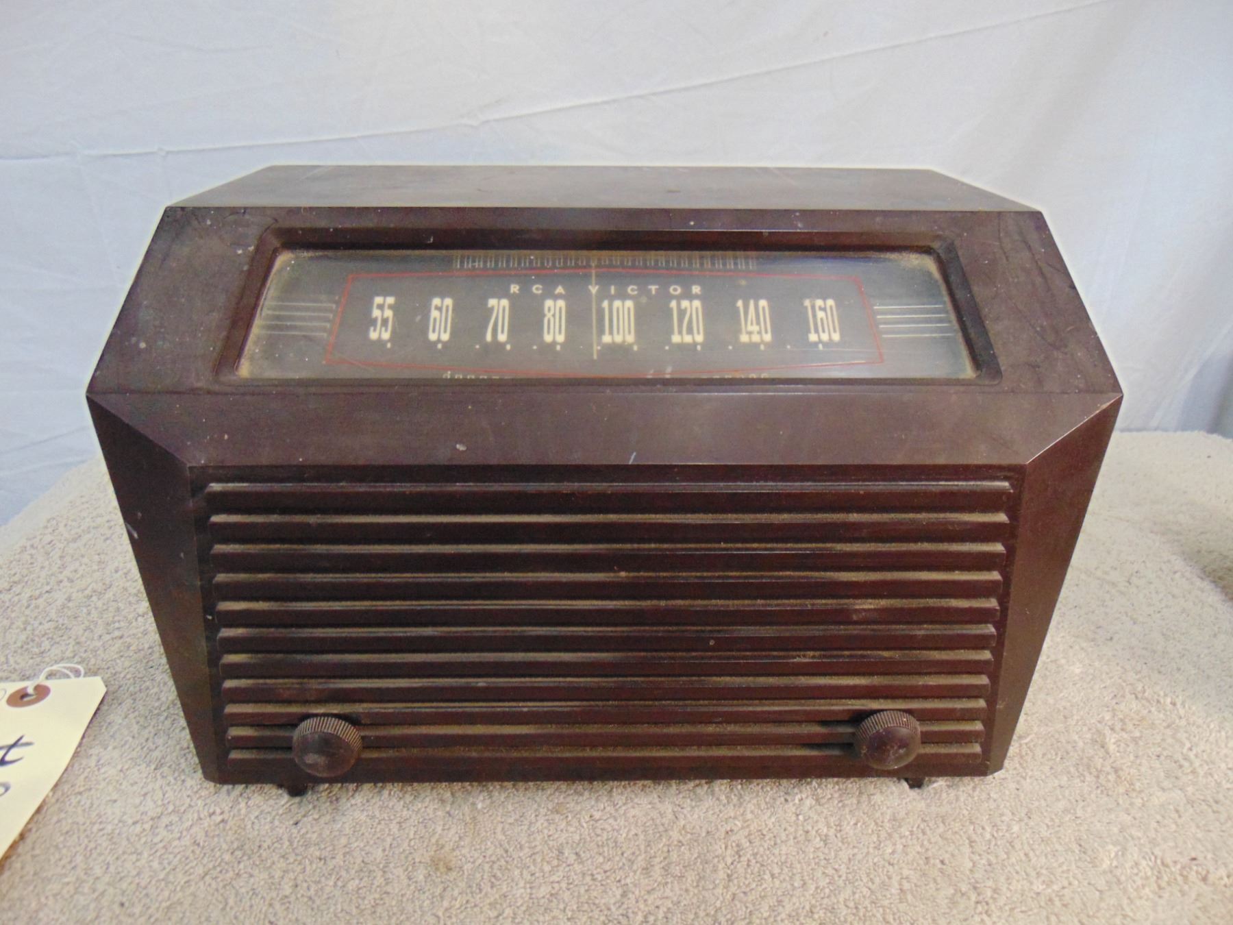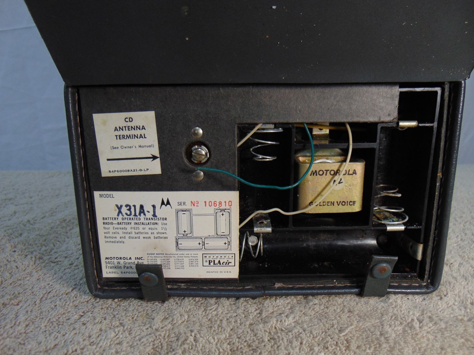 Two items: 1) RCA brown bakelite table set, model 9X641, original back, no cracks; 2) Motorola portable, model X31A-1, leather case, missing 1 knob, nice condition