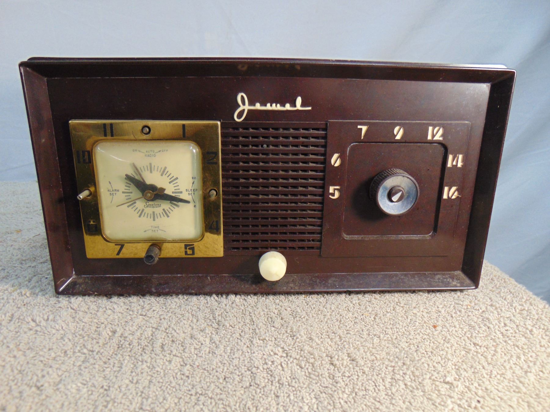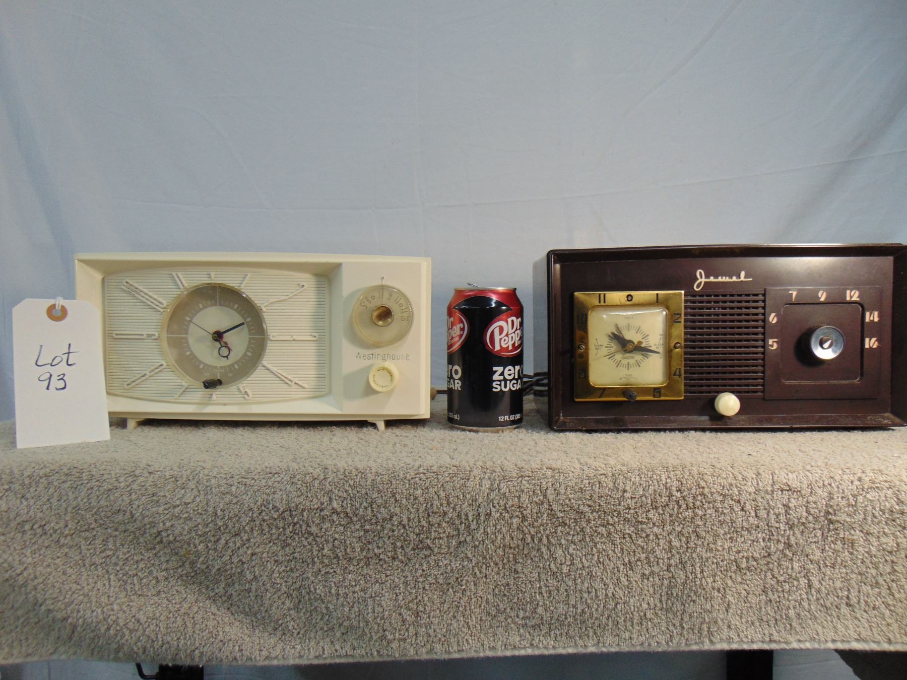 Two sets: 1) Westinghouse white plastic clock radio, model H16L5, nice condition; 2) Jewel brown bakelite clock radio, model 940, nice condition; both sets have original back; both radios work