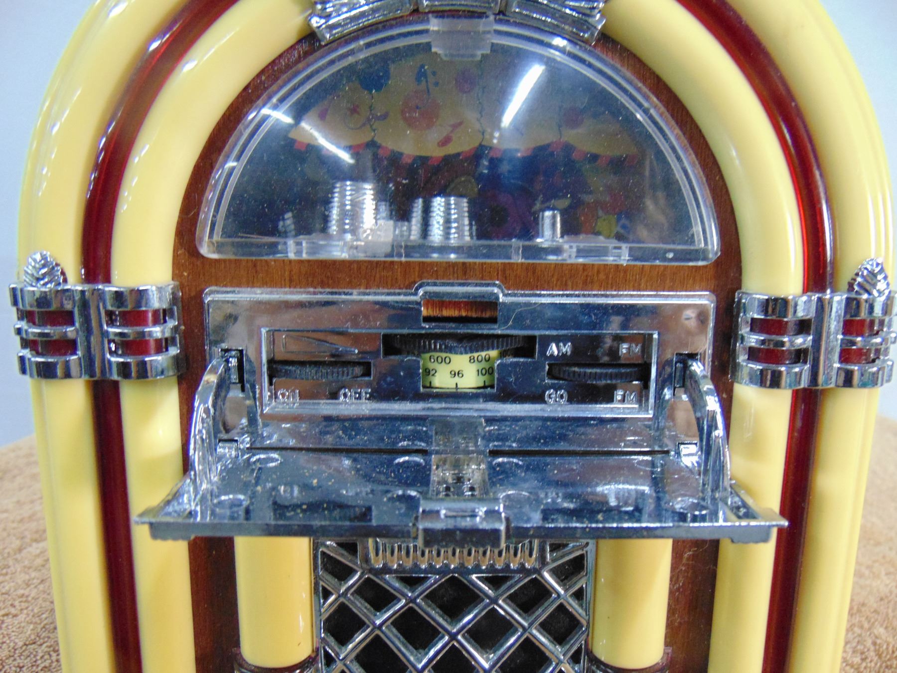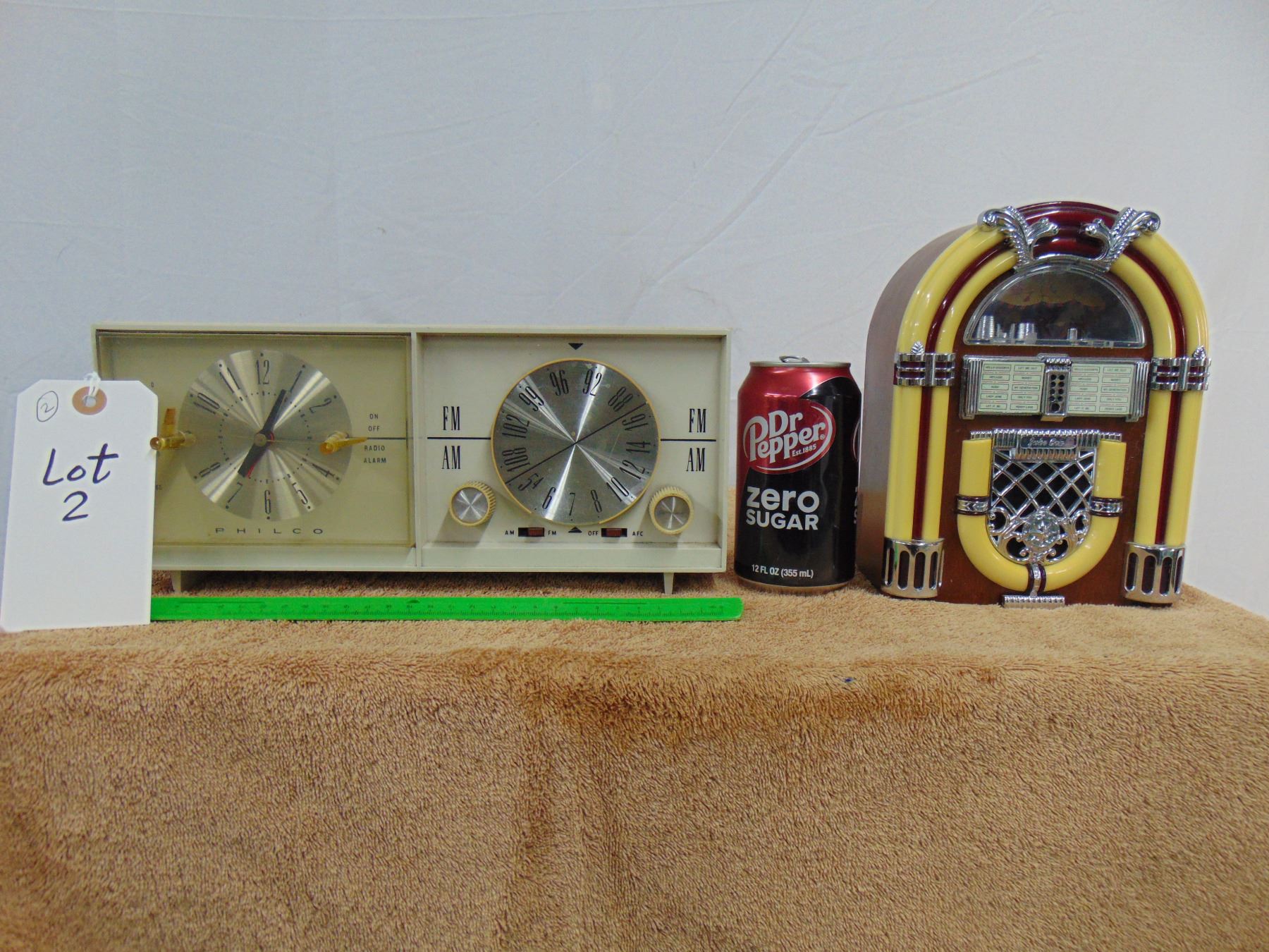 Two items: 1) Philco plastic clock radio, no cracks, original back; 2) novelty jukebox radio, AM/FM, wood cabinet