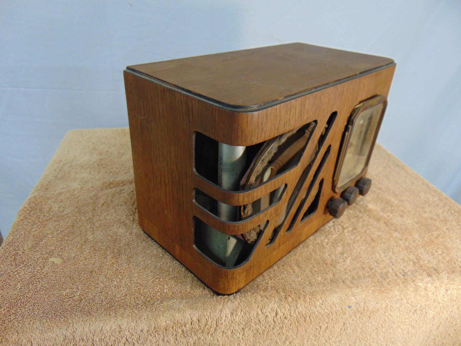 Two items:  1) GE Musaphonic plastic clock radio, crack on top, original back, hums, clock runs;  2) Philco wood table set, model 38-15, good restorable condition