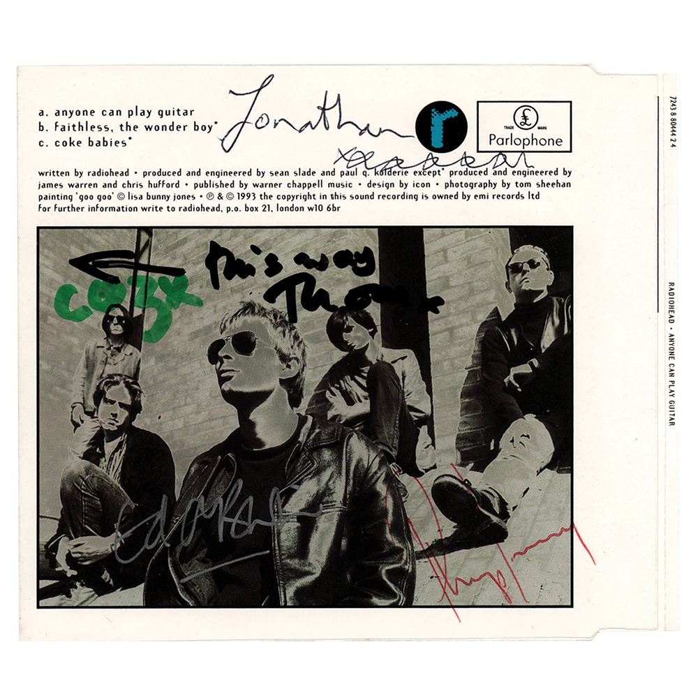 CD sleeve for the early Radiohead single 'Anyone Can Play Guitar,' signed on the back cover in multicolored ink and felt tip by Thom Yorke, Colin Greenwood, Jonny Greenwood, Ed O'Brien, and Philip Selway. In fine condition. The CD is not included.