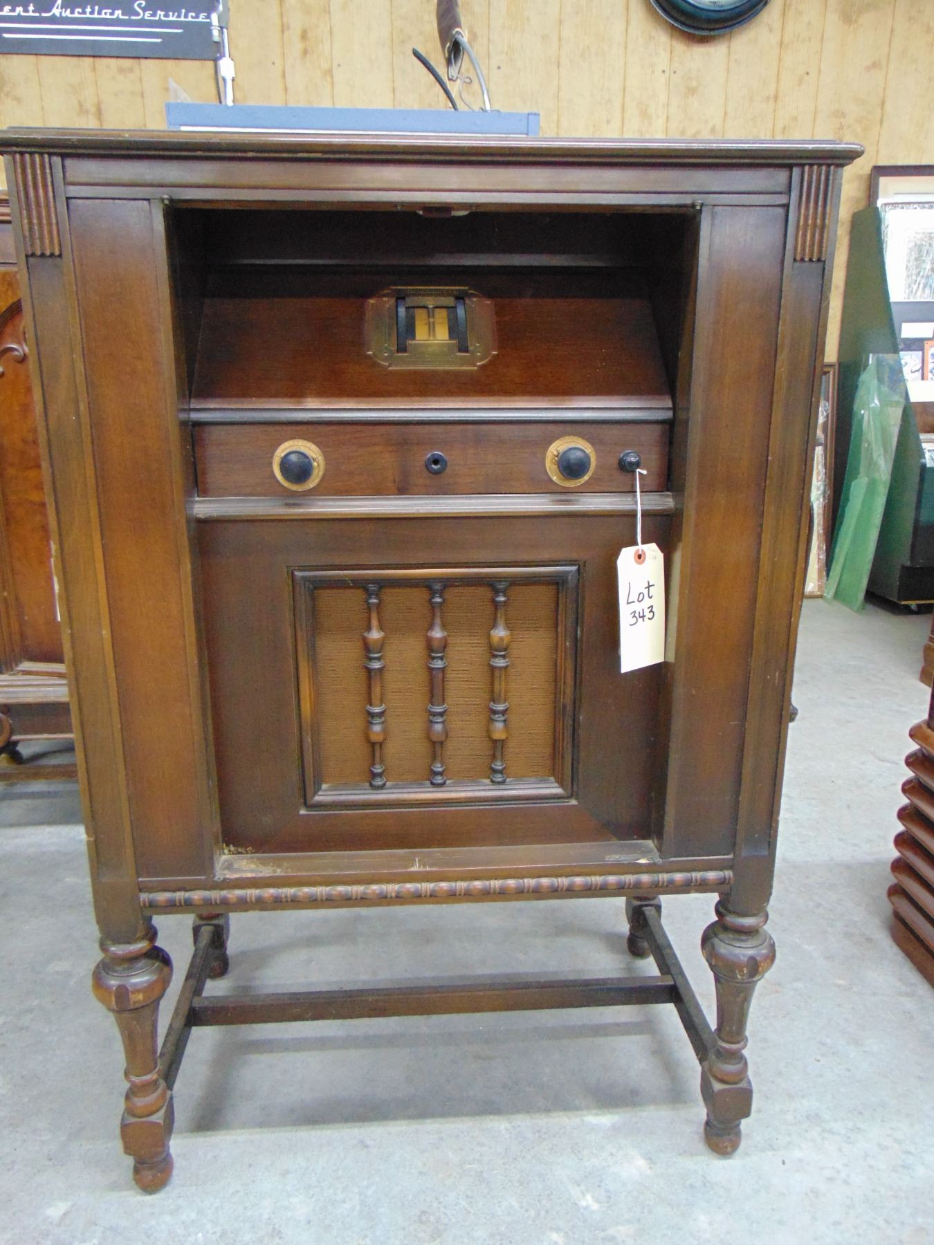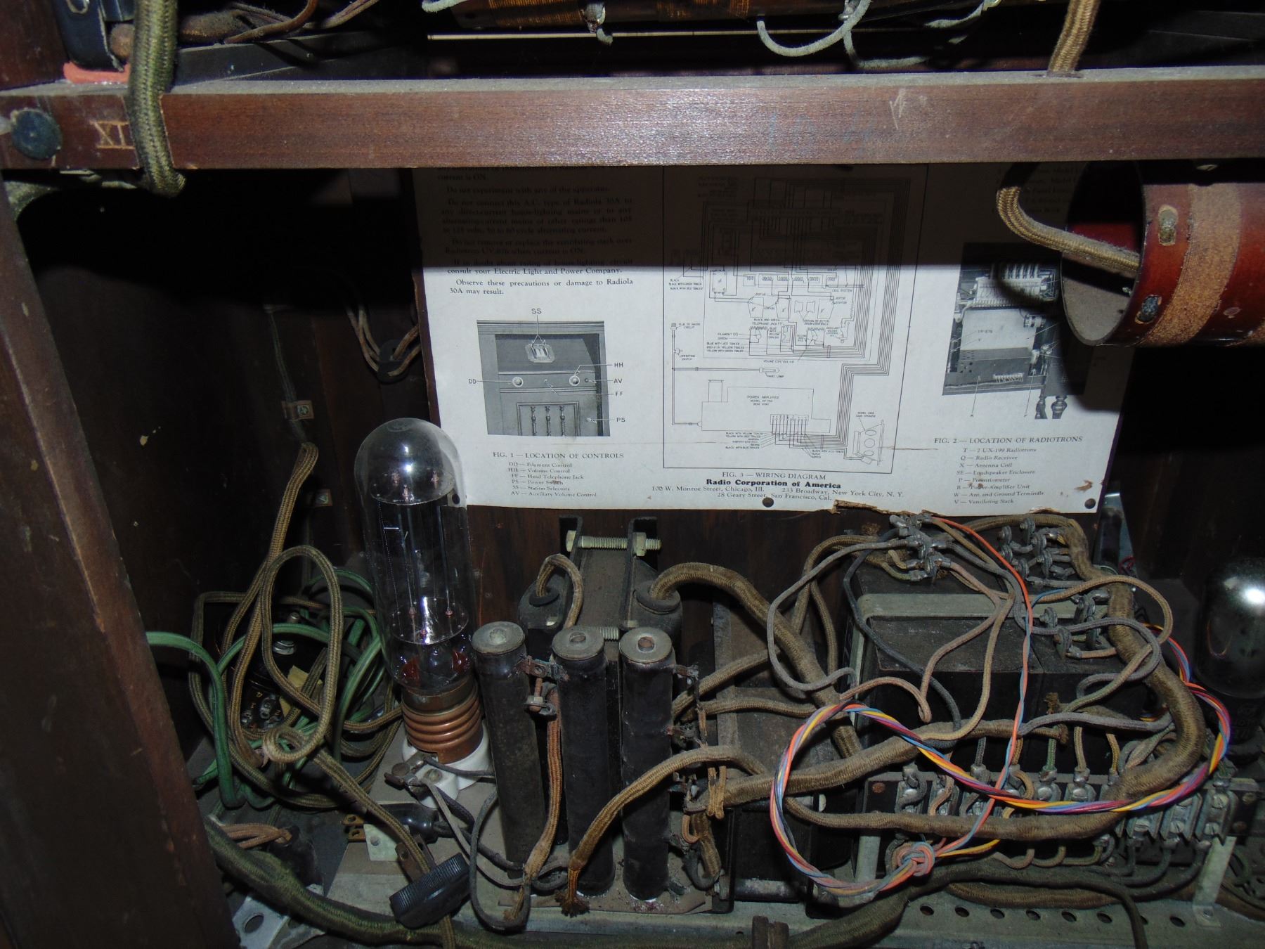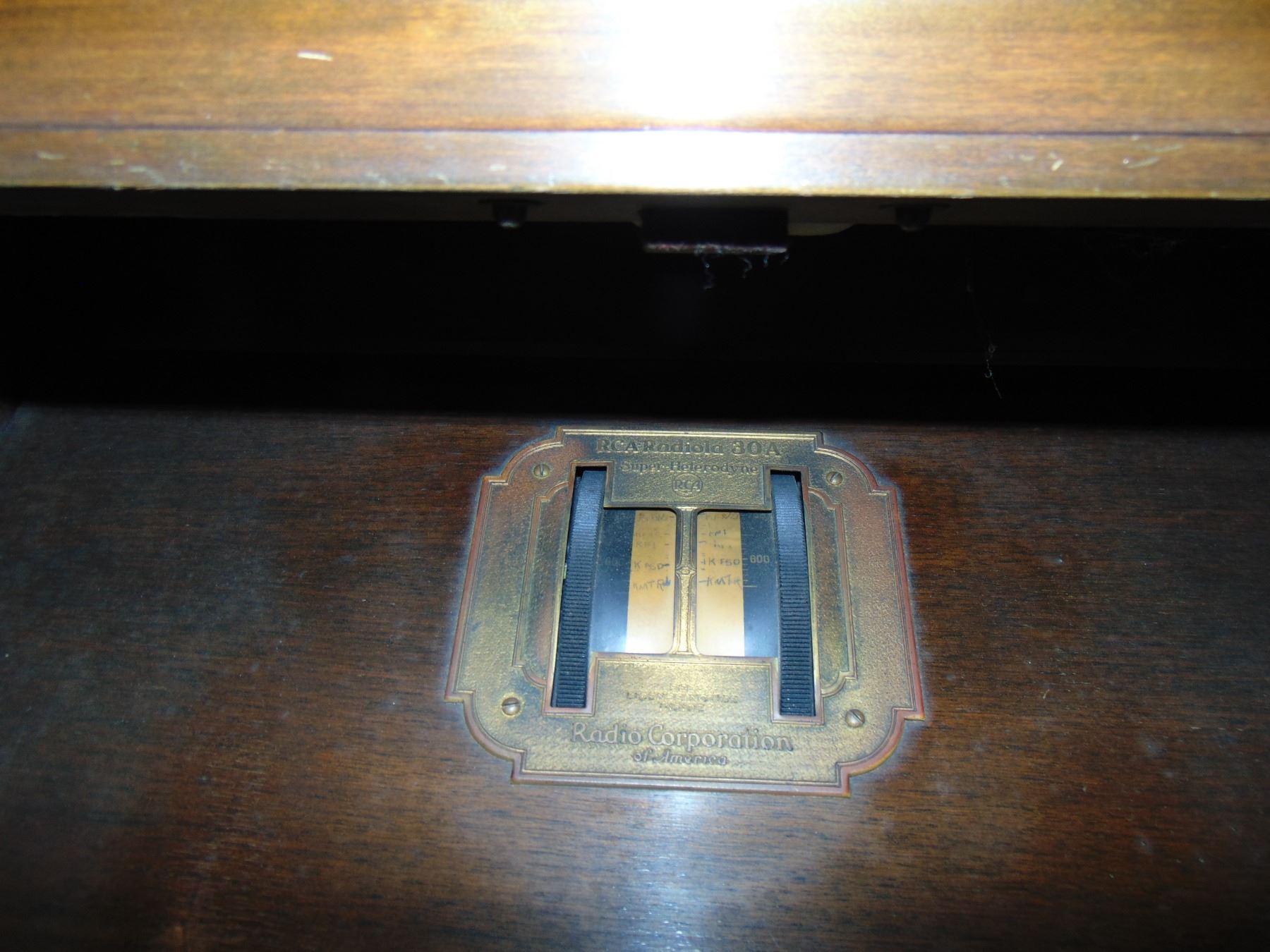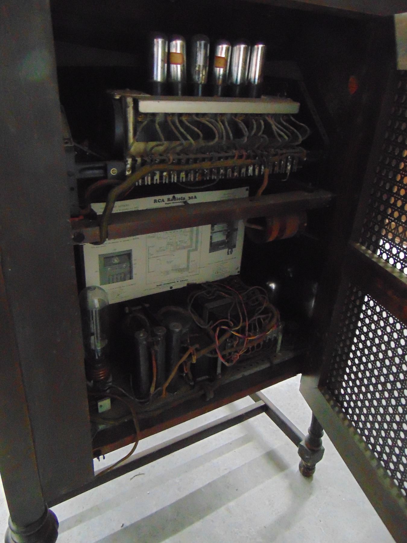 Console; model 30A; original wicker back; missing one type 99 tube; nice original condition; this cabinet model originally had doors which are missing.