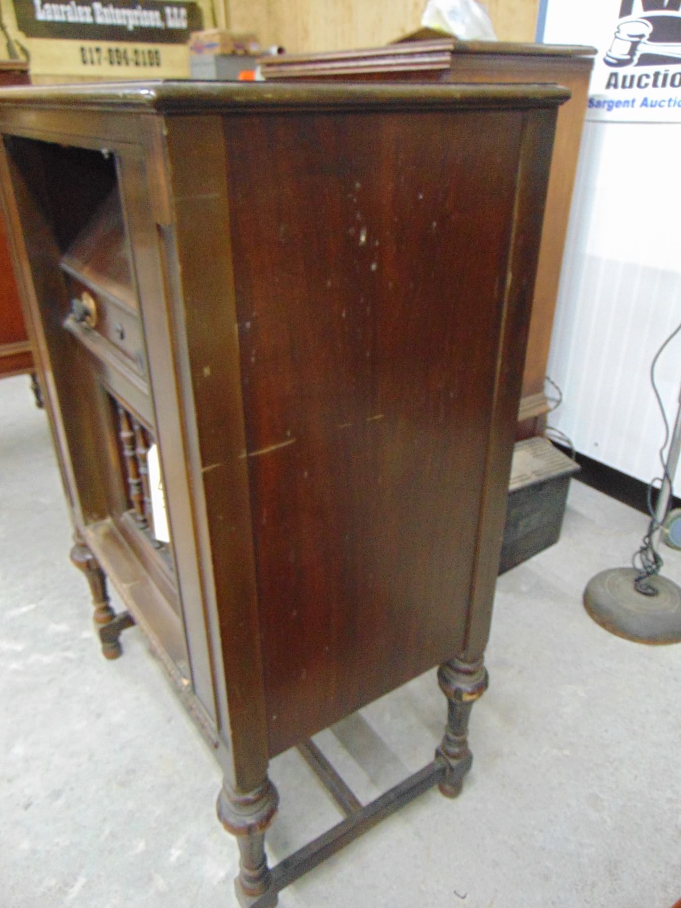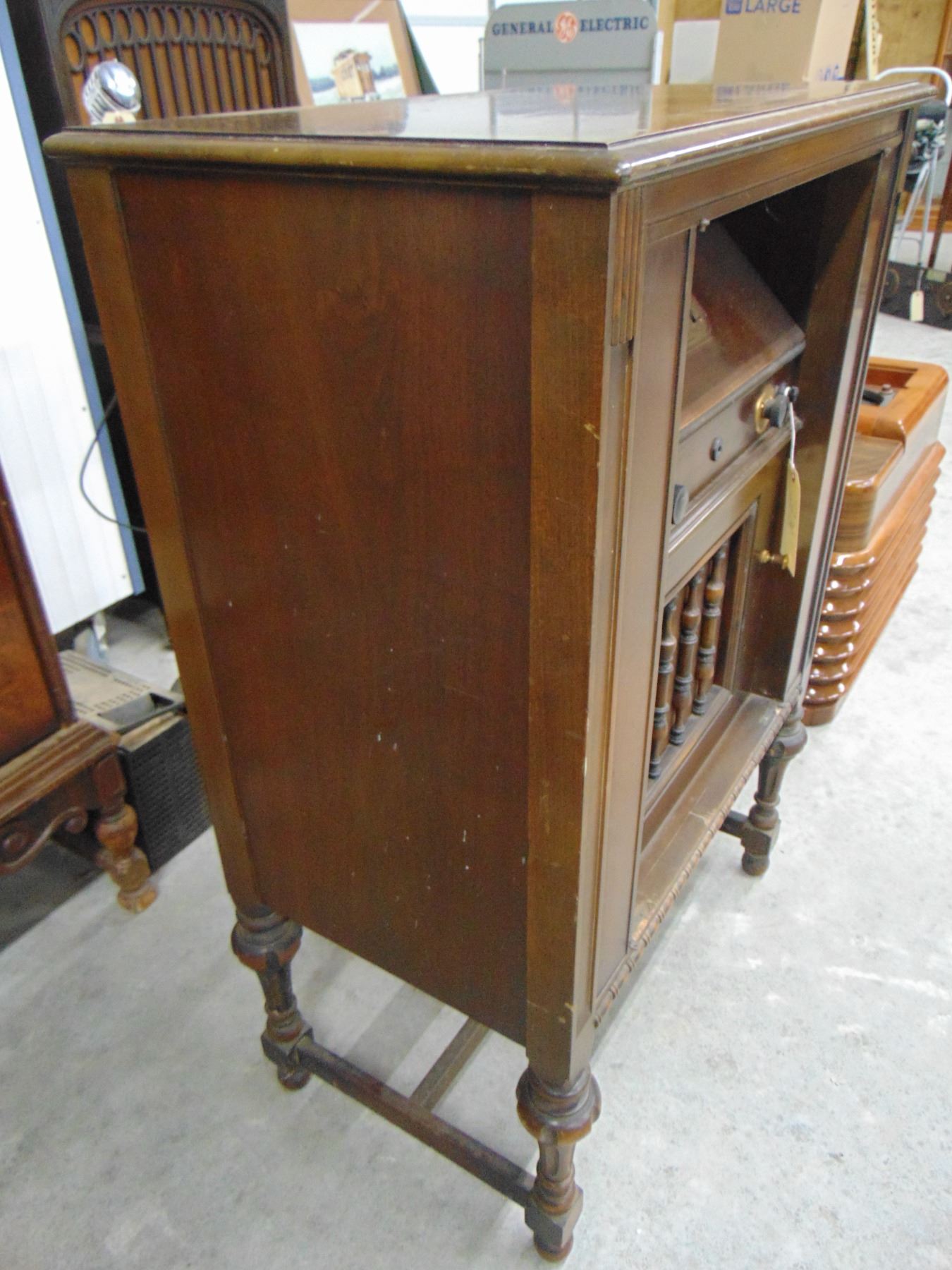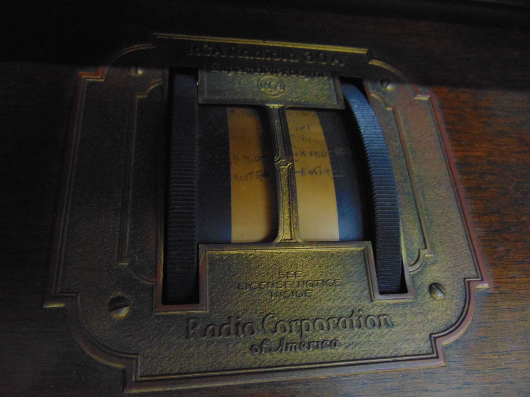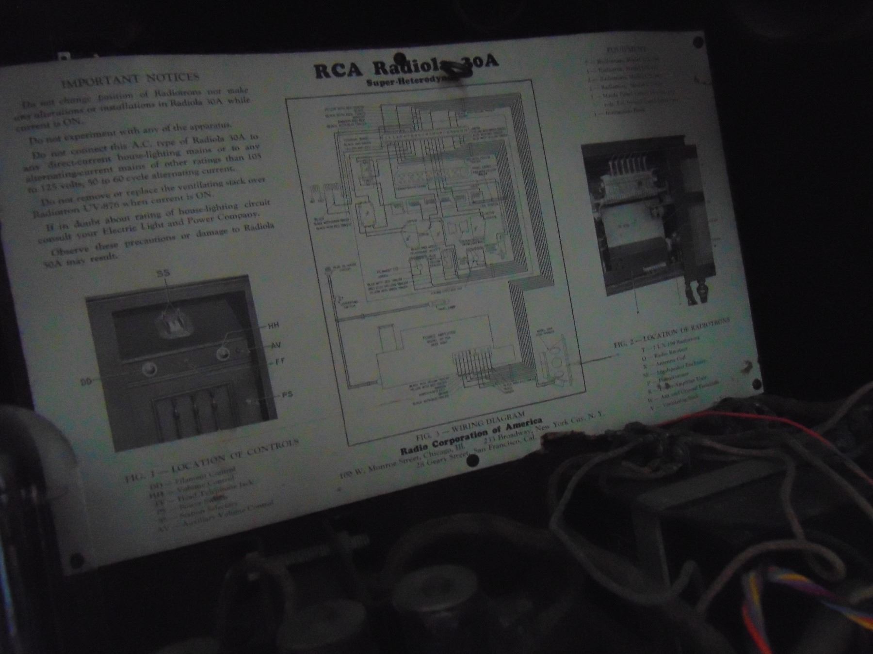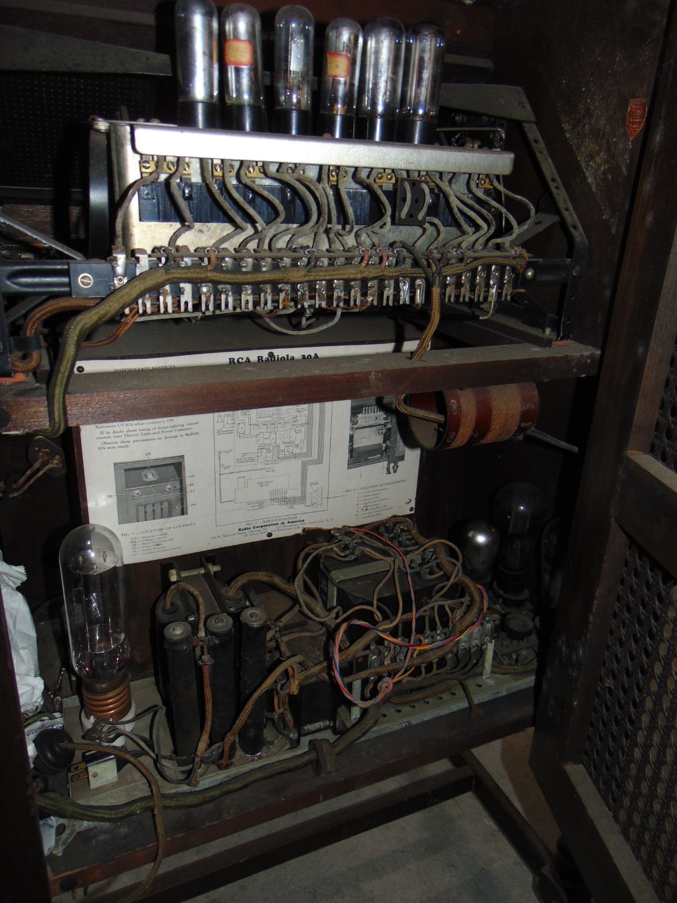 Console; model 30A; original wicker back; missing one type 99 tube; nice original condition; this cabinet model originally had doors which are missing.