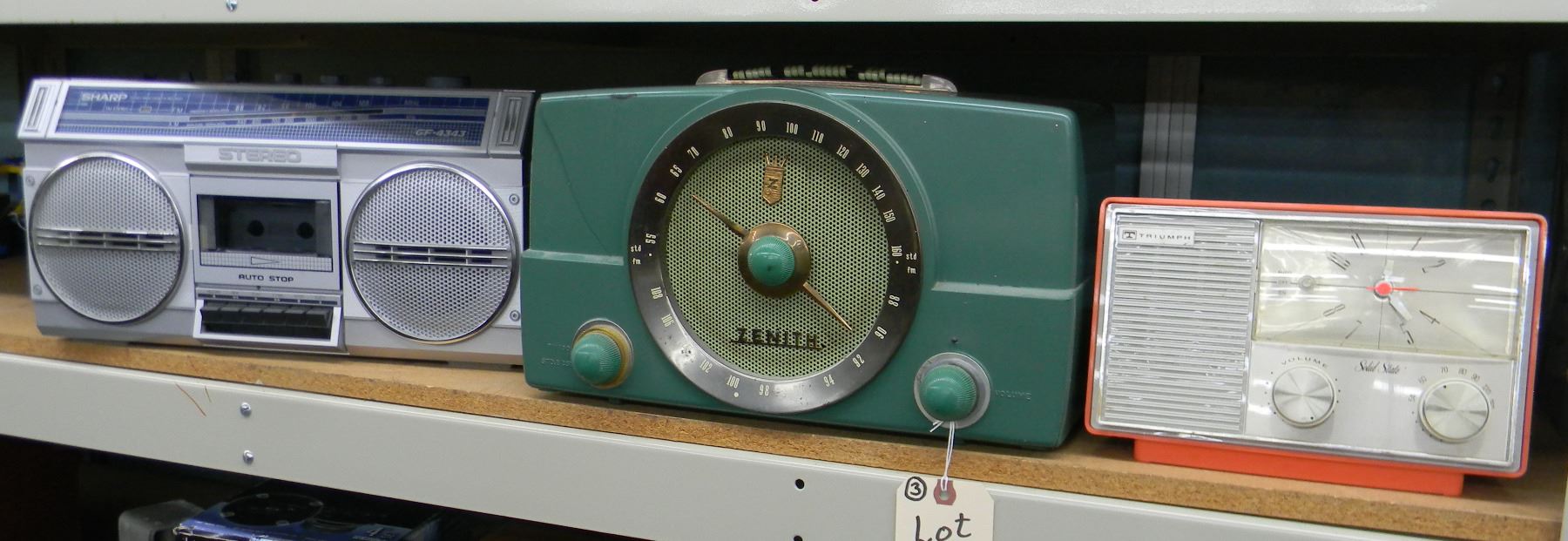 Sharp portable cassette/radio; Triumph orange; Zenith big green model H-725; all work