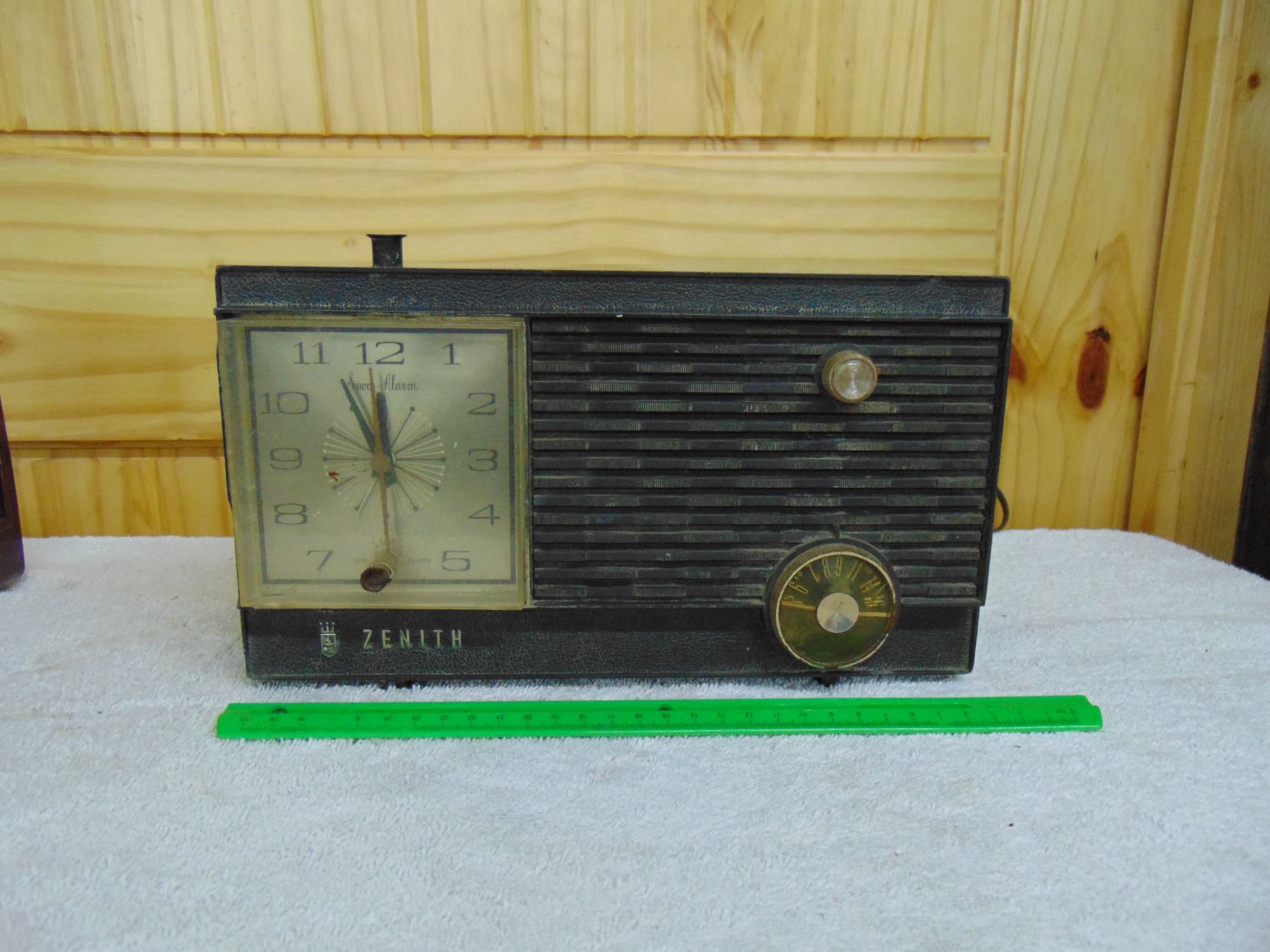 Two items: Zenith clock radio, model M511C, original back: ALSO, Teletone maroon bakelite set; both have minor cabinet damage