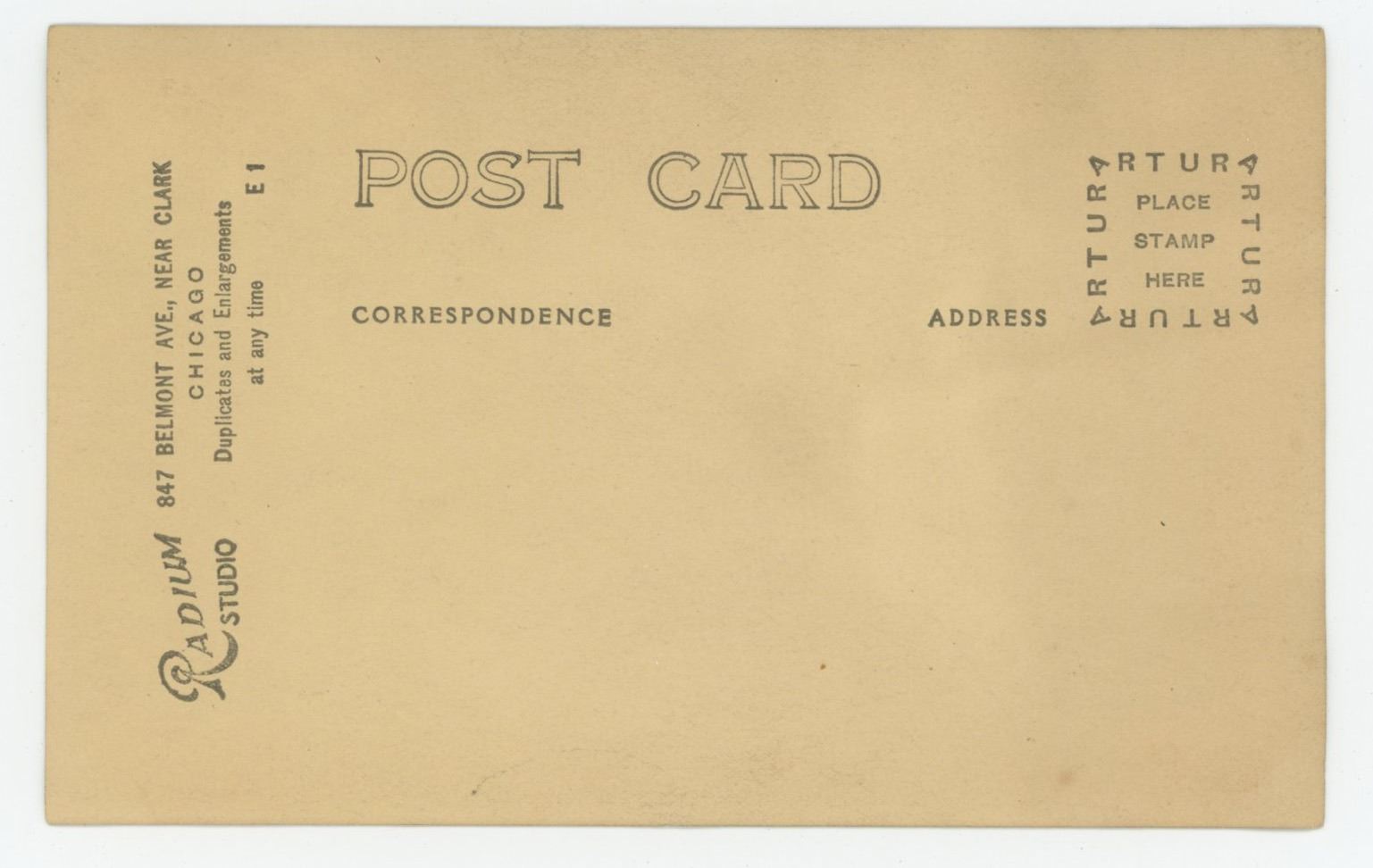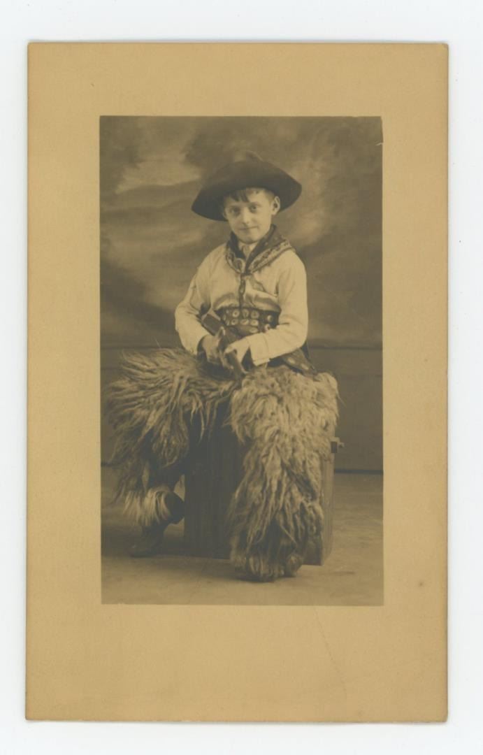 Wearing wooly chaps and a studded belt, holding a shotgun. Radium studio Chicago