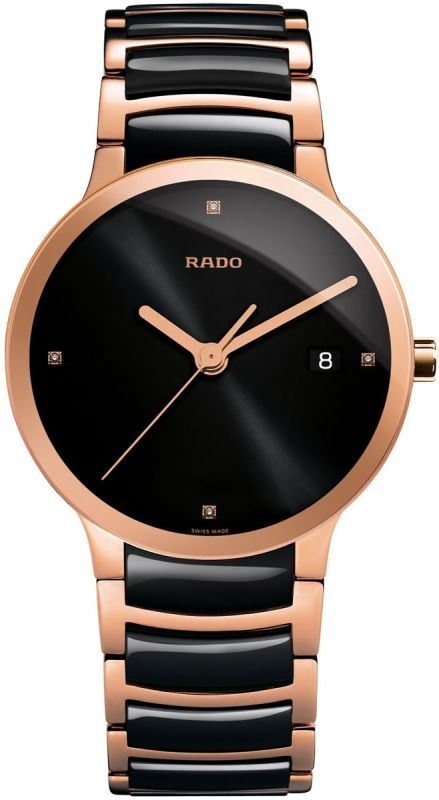 Model: R30554712 - CASE = [Material:Stainless Steel], [Case Diameter:38], [Bezel:Fixed], [Case Back:Solid], [Water Resistant:30 Meters/100 Feet], [Crystal:Scratch Resistant Sapphire], DIAL = [Color:Black with Diamond Hour Markers,Rose Gold Hands, Date at 3], MOVEMENT = [Type:Battery Powered Quartz], BAND = [Clasp:Deployment], [Type:Stainless Steel with Scratch Resistant High-Tech Ceramic], (Usually ships in 2 to 4 weeks.)