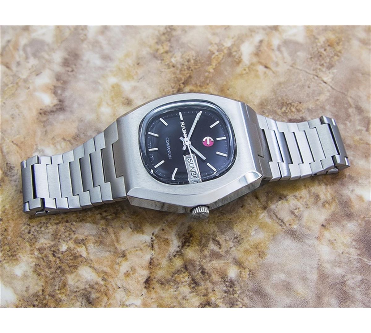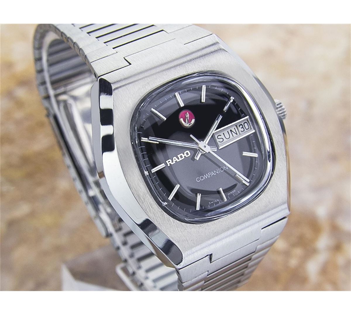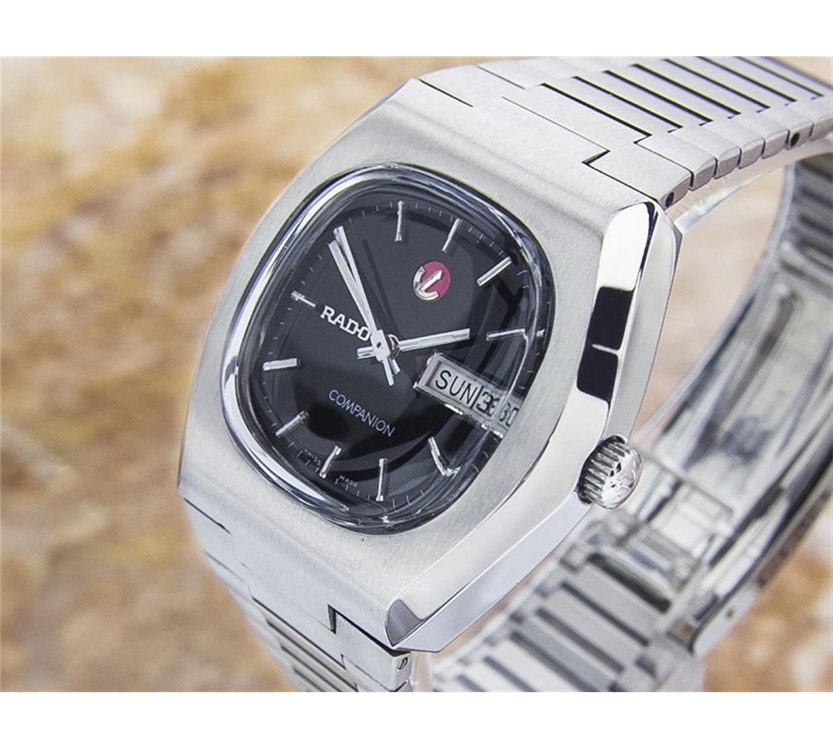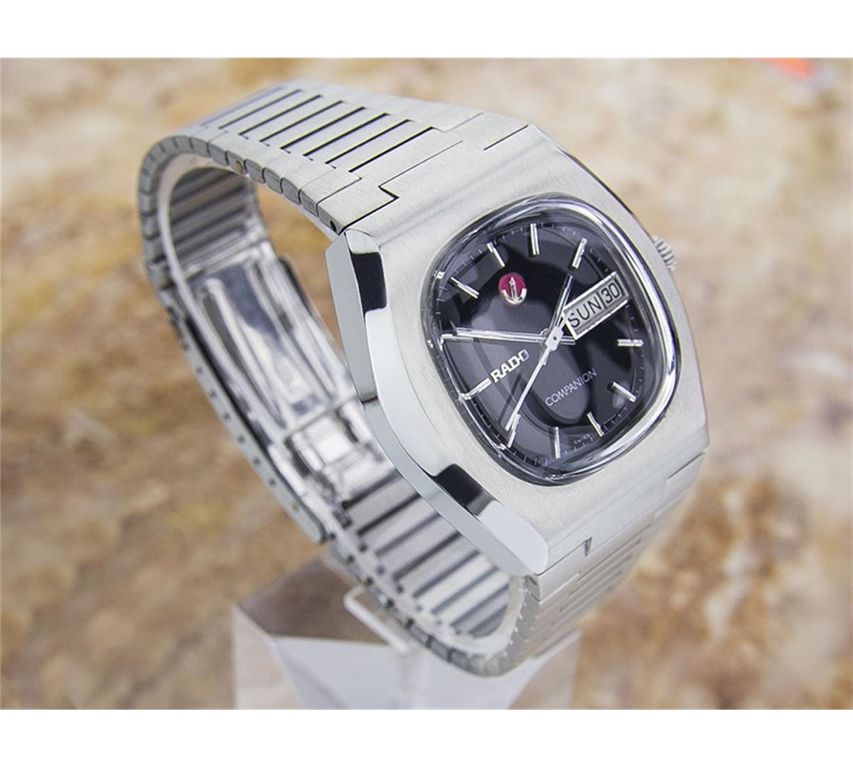 Rado Companion Day Date Stainless Steel Automatic Watch. Brand: RADO. Model: COMPANION. Movement: Automatic. Case Material: Stainless Steel. Crystal: ACRYLIC. Case Size: 32x37. Band: ORIGINAL Stainless Steel BRACELET.
