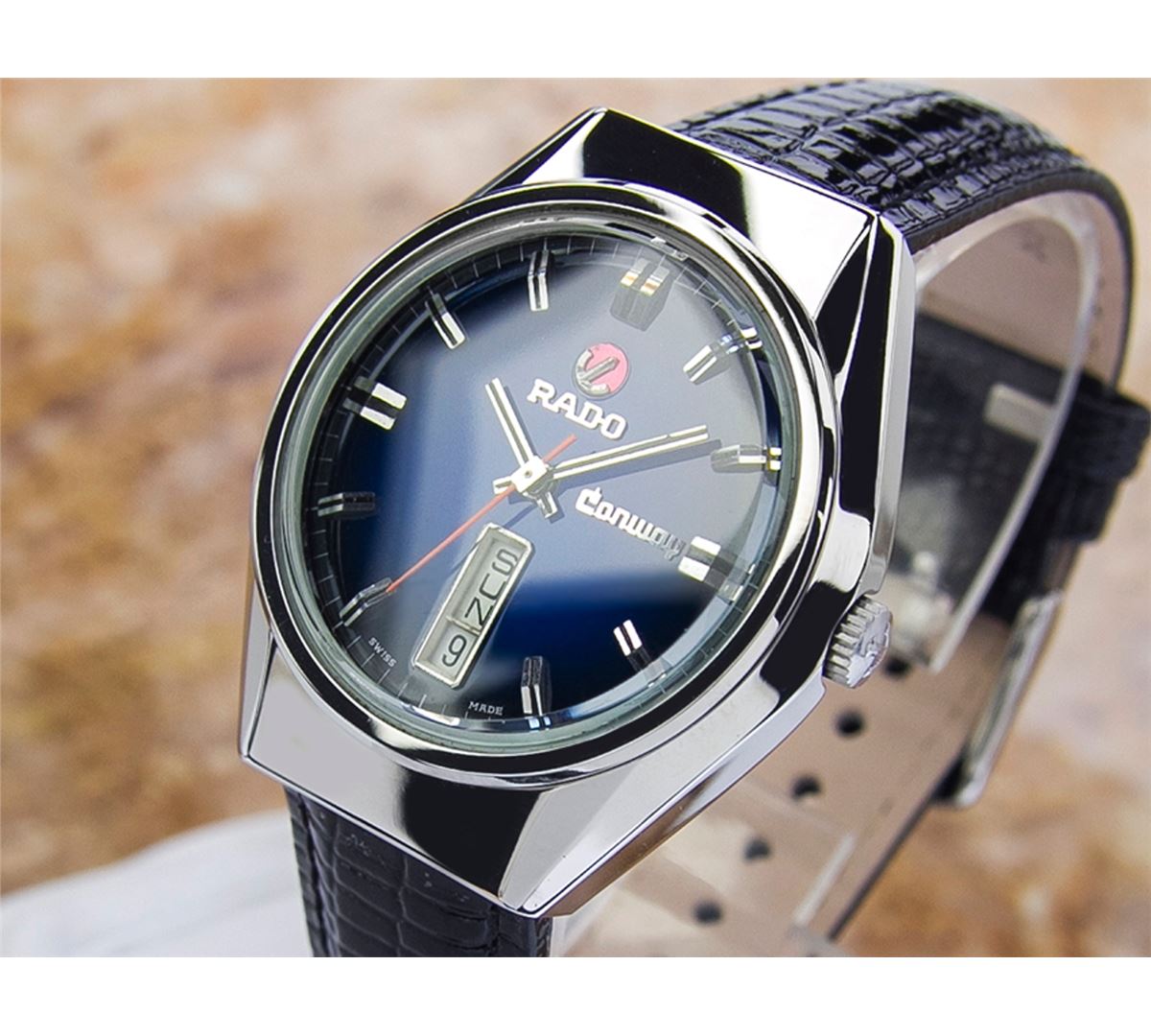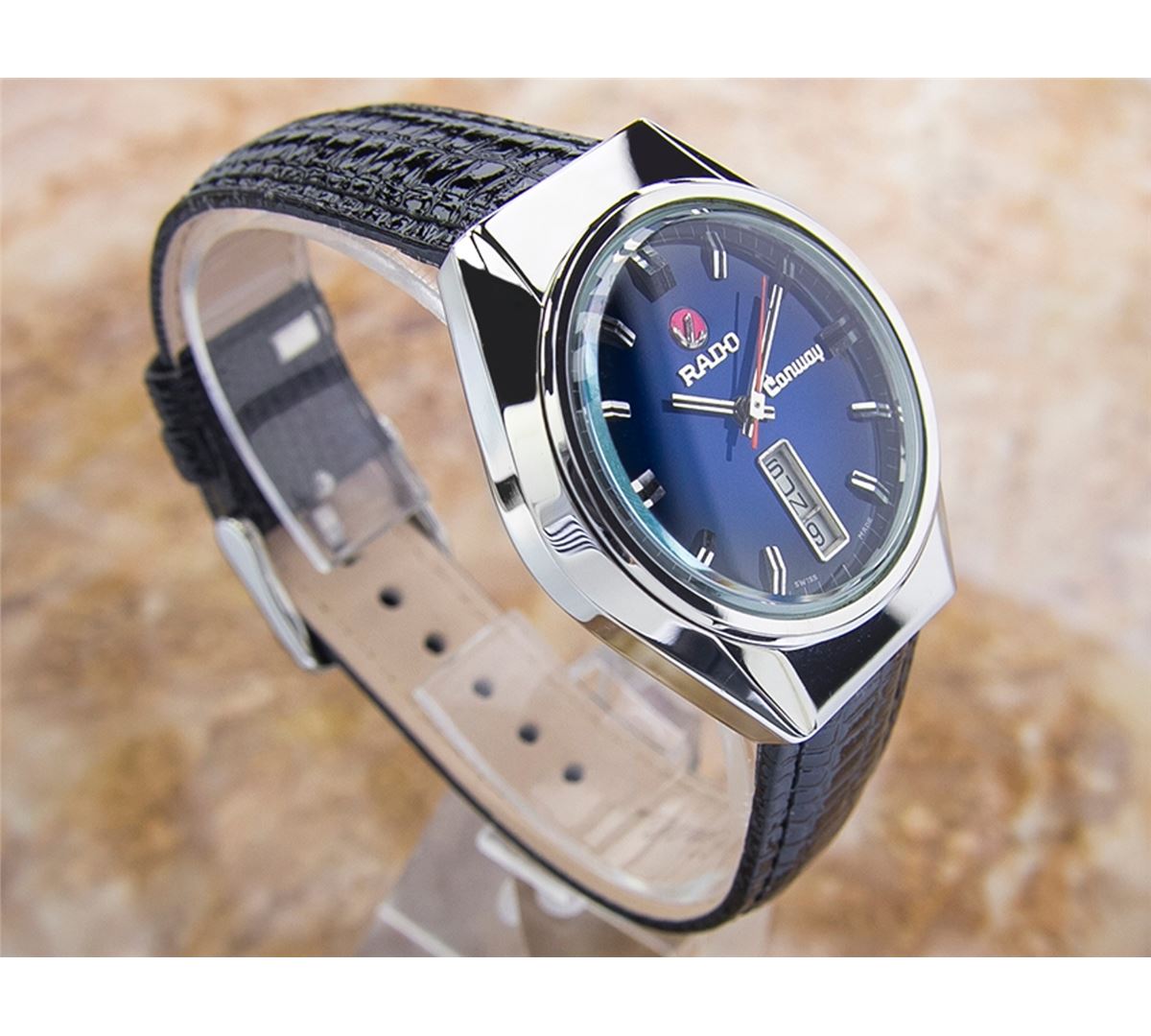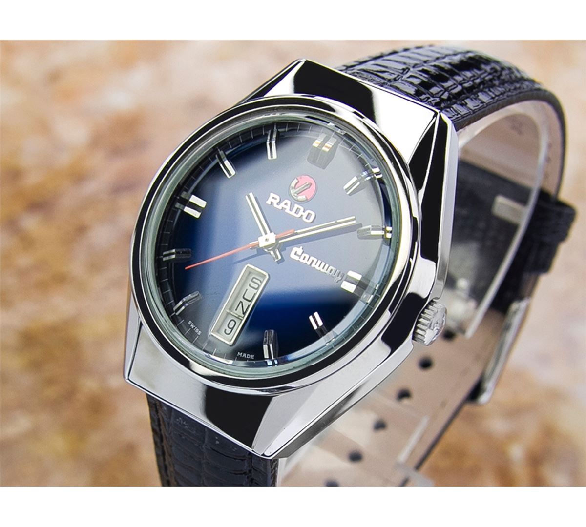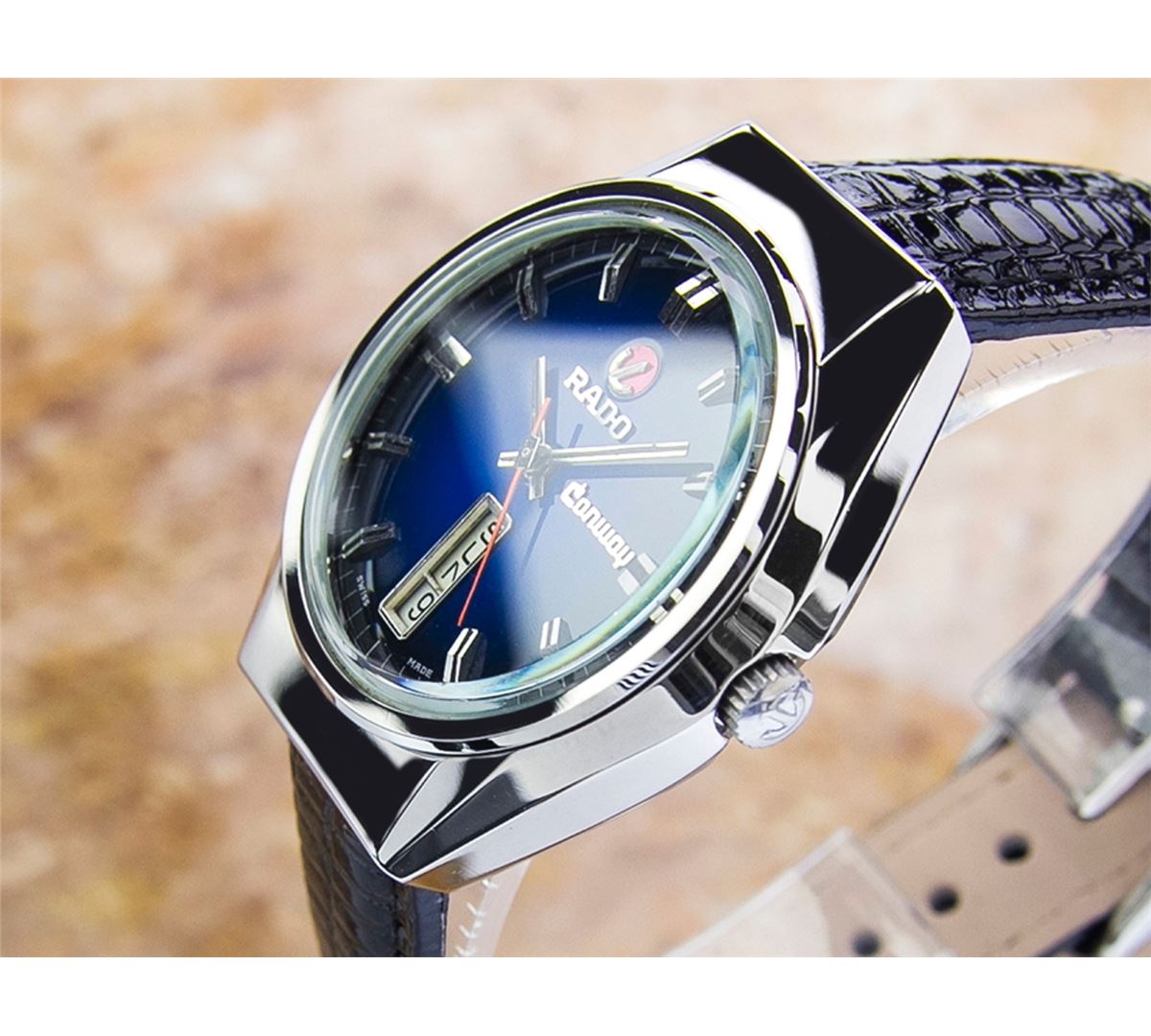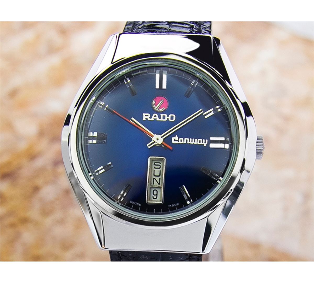 Rado Conway Day and Date Stainless Steel Automatic Watch. Brand: RADO. Model: CONWAY. Movement: Automatic. Case Material: Stainless Steel. Crystal: MINERALGLASS. Case Size: 40X36. Band: NEW LEATHERBAND.
