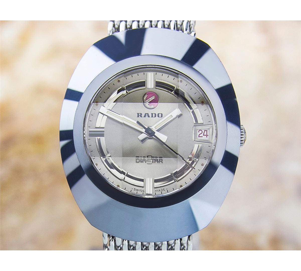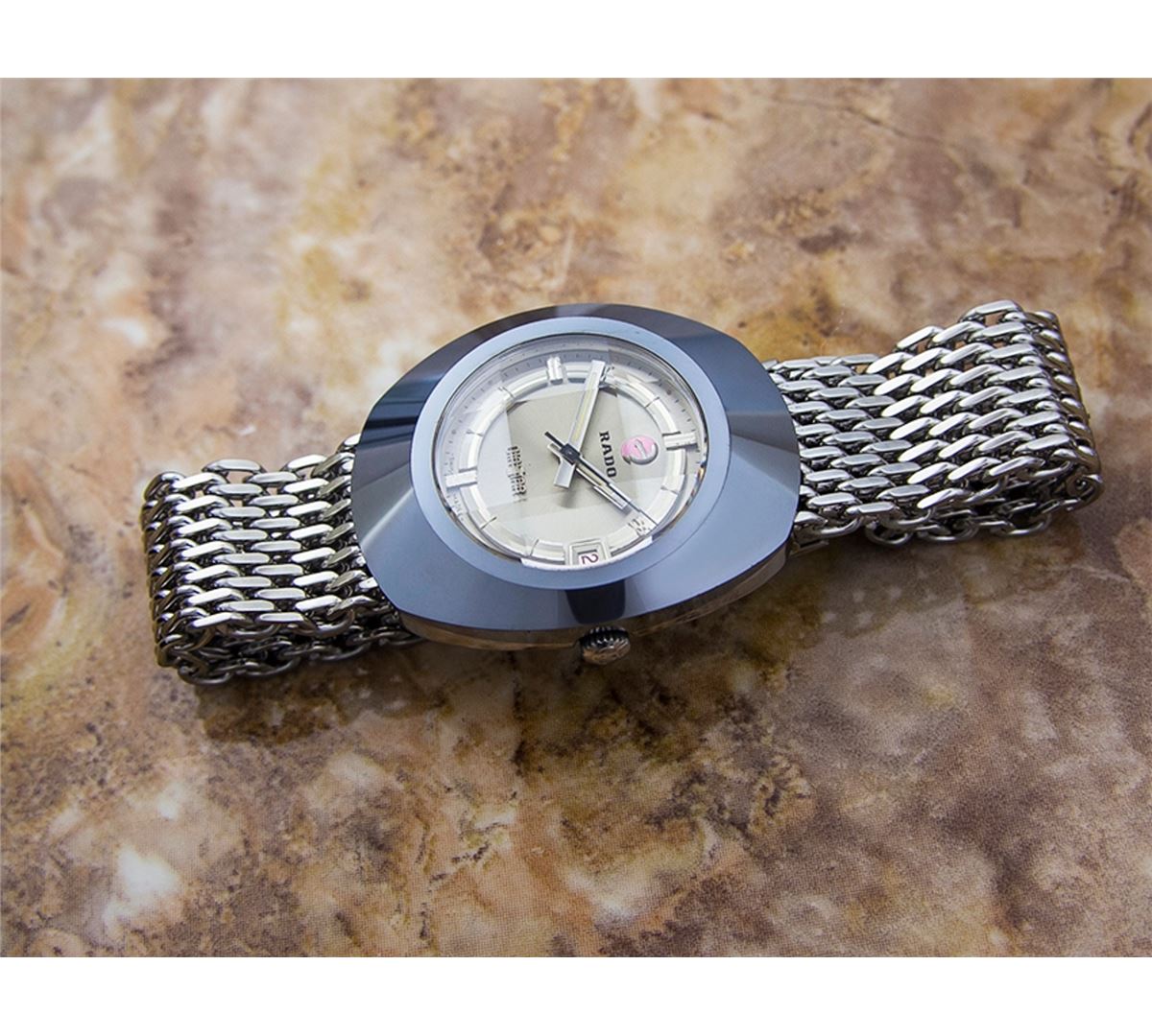 Rado Diastar Date Stainless Steel Automatic Watch. Brand: RADO. Model: DIASTAR. Movement: Automatic. Case Material: Stainless Steel. Crystal: MINERAL GLASS. Case Size: 42X35. Band: Stainless Steel BRACELET.