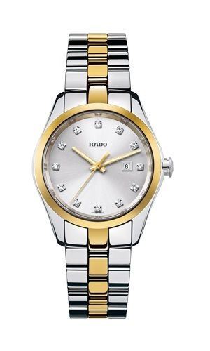 Model: R32975712 - CASE = [Material:Polished Stainless Steel with Yellow Ceramos], [Case Diameter:31.5], [Bezel:Fixed], [Case Back:Solid], [Water Resistant:50 Meters/165 Feet], [Crystal:Scratch Resistant Sapphire],; DIAL = [Color:Silver with Luminescent Hands and Diamond Hour Markers],; MOVEMENT = [Type:Battery Powered Quartz],; BAND = [Clasp:Double Fold Over], [Type:Polished Stainless Steel with Yellow Ceramos], (Usually ships in 2 to 4 weeks.)