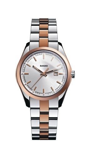 Model: R32976102 - CASE = [Material:Polished Stainless Steel with Rose Gold Ceramos], [Case Diameter:31.5], [Bezel:Fixed], [Case Back:Solid], [Water Resistant:50 Meters/165 Feet], [Crystal:Scratch Resistant Sapphire], DIAL = [Color:Silver with Rose Gold Luminescent Hands and Hour Markers], MOVEMENT = [Type:Battery Powered Quartz], BAND = [Clasp:Push Button Deployment], [Type:Polished Stainless Steel and Rose Gold Ceramos], (Usually ships in 2 to 4 weeks.)
