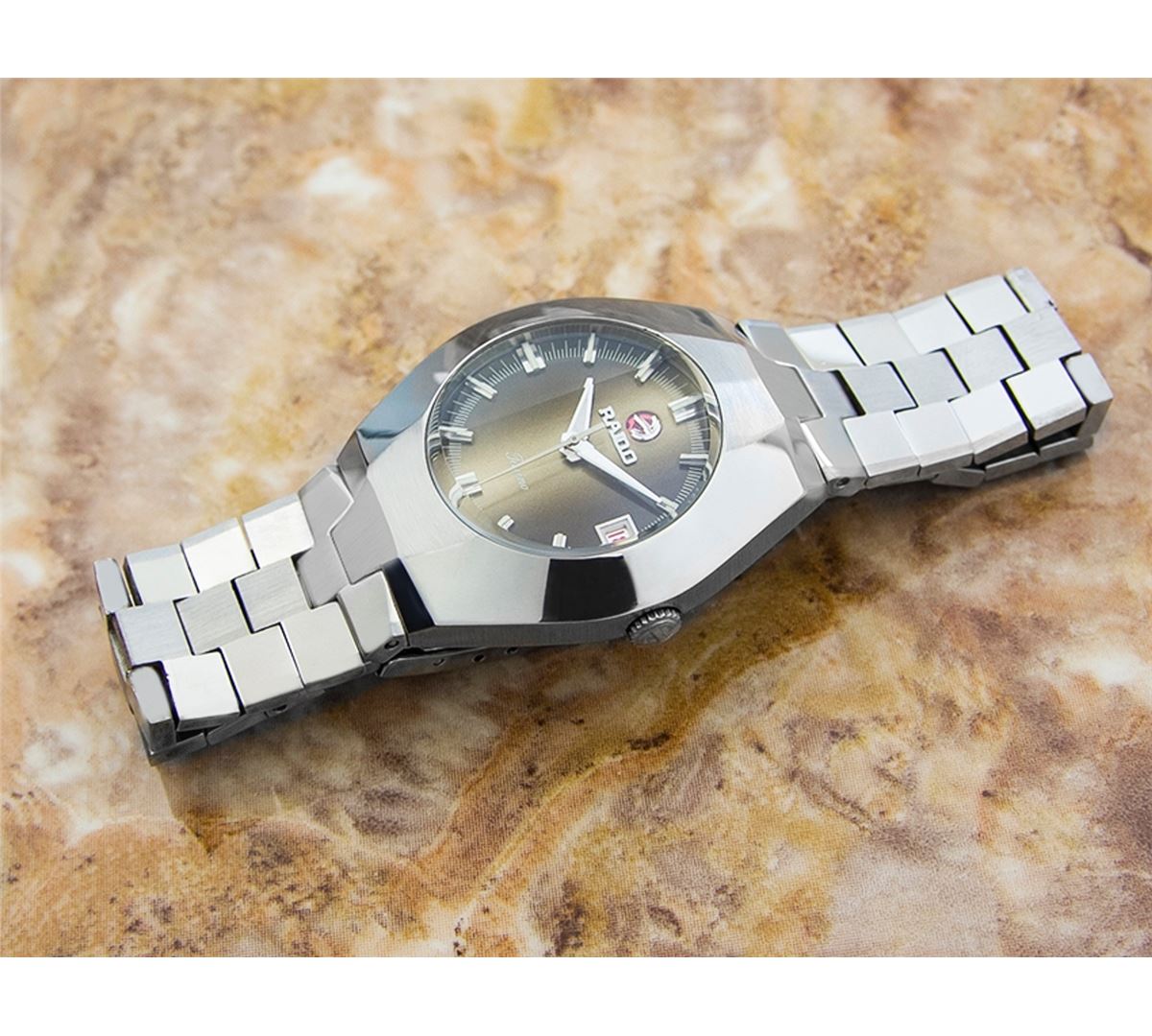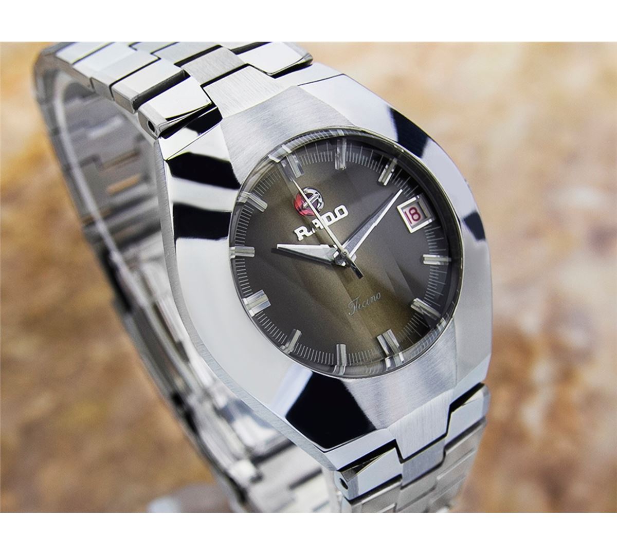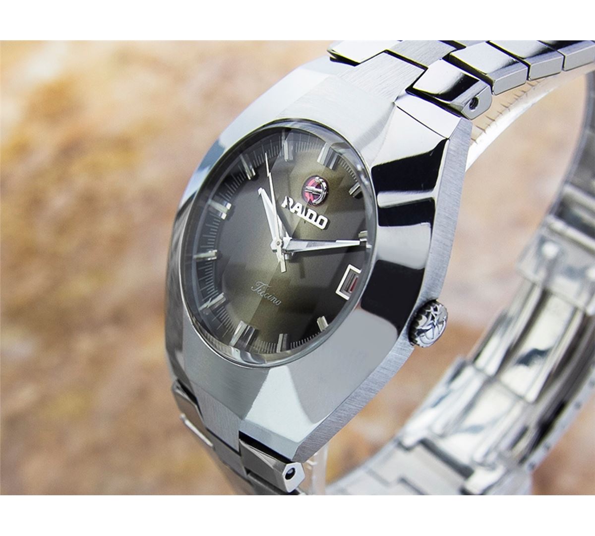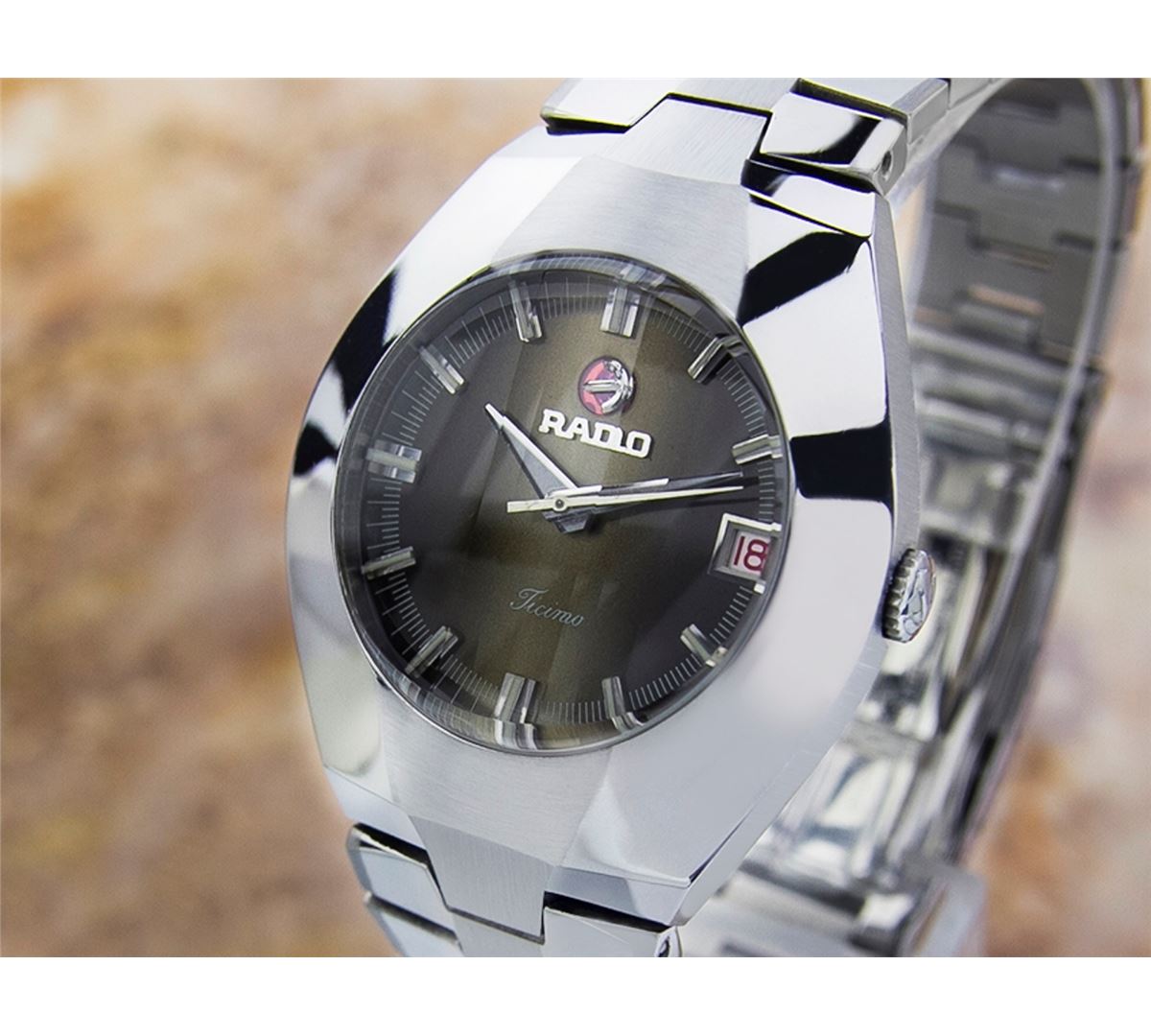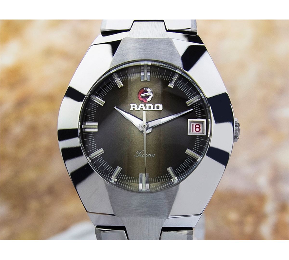 Rado Ticino Date Stainless Steel Automatic Watch. Brand: RADO. Model: TICINO. Movement: Automatic. Case Material: Stainless Steel. Crystal: MINERAL GLASS. Case Size: 39X35. Band: ORIGINAL Stainless Steel BRACELET.