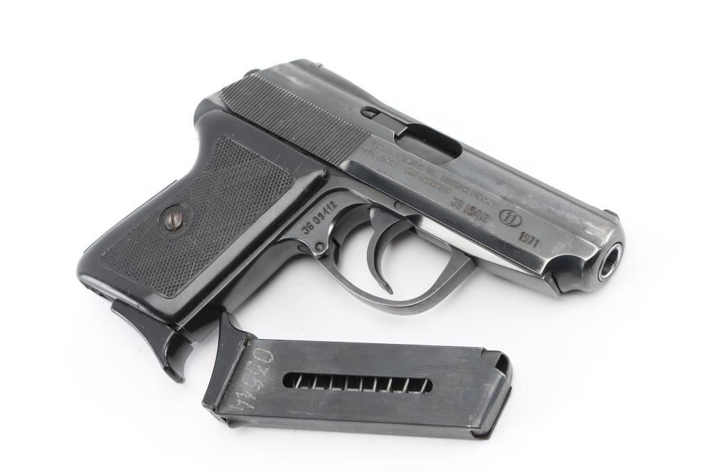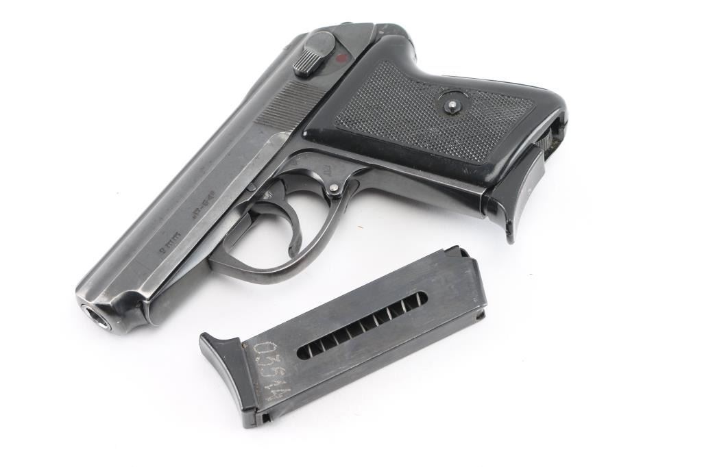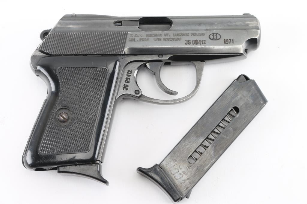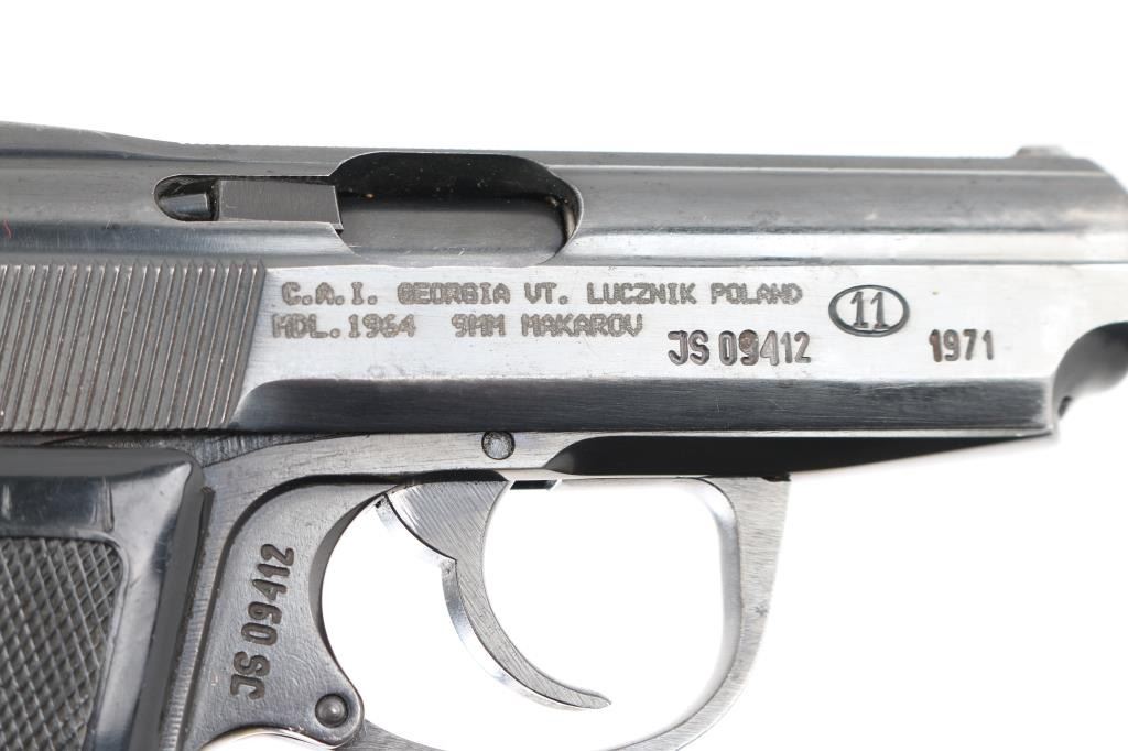 Cold War era semi-Automatic. 6+1 Capacity. Polish made "Makarov". Manufactured 1971. Blowback action. 3.3" barrel. Front blade and notch rear sights. Slide mounted thumb safety, Imported by CAI. (Left slide) Blued metal slide. Parkerized frame. One-piece checkered black plastic grips. Bore appears excellent/bright. Blue finish is about 80% with some edge wear/scratches, handling loss. Slide action is smooth/tight. Grips are very good. Comes with brown leather Military/Police shoulder holster , two 6-rd magazines. NRA Condition-Very Good. C&R Firearm.