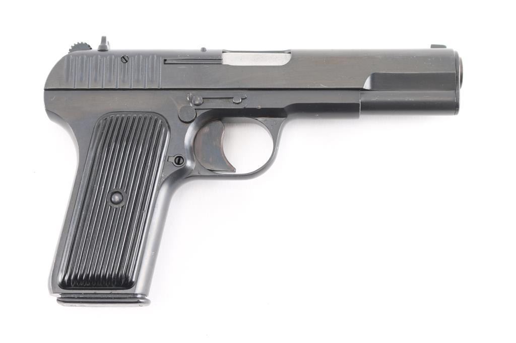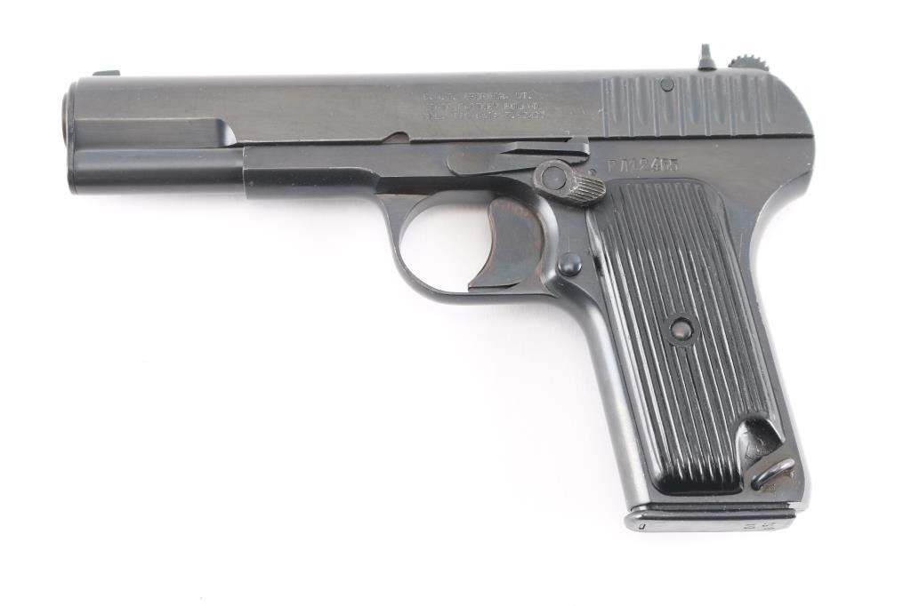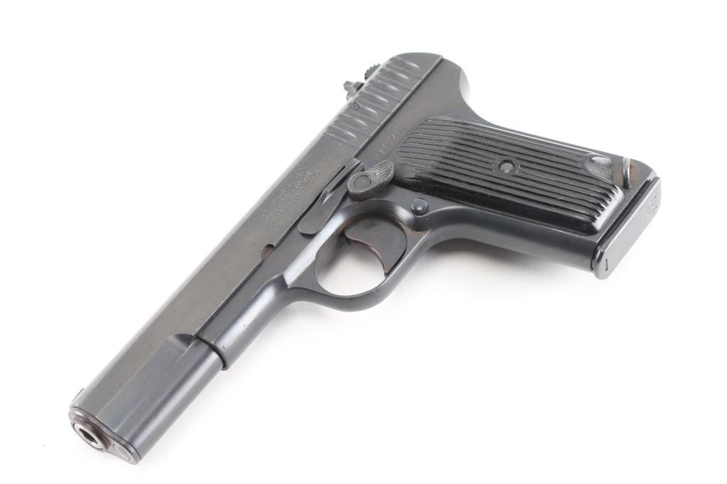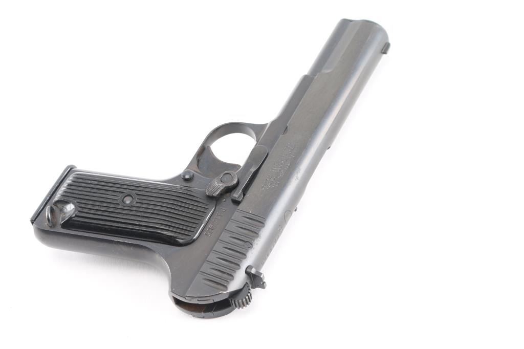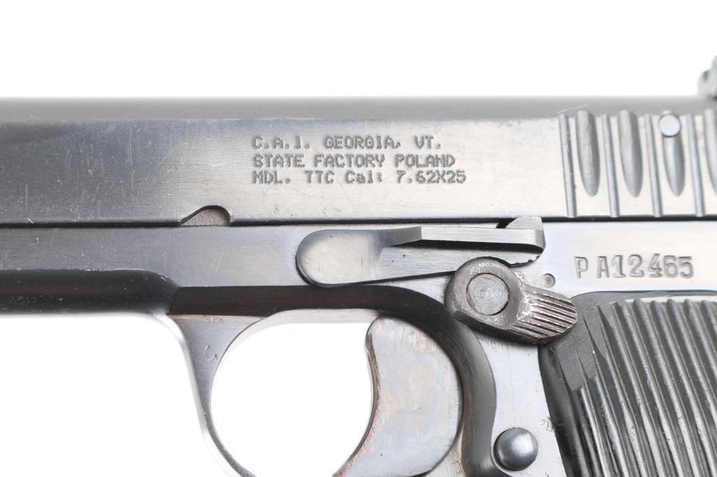 'wz.33' Polish Tokarev copy military pistol imported by CAI, Georgia VT. Features dark blued finish, approx 4.5" barrel, fixed sights, detachable magazine, manual safety on left side of frame, push button magazine release, lanyard loop, black plastic ribbed grips. Bore is very good condition. Retains 95% arsenal re-finish with handling marks. Grips are very good condition. Original markings include 1952 date, "Circle 11". Includes one mismatched magazine.