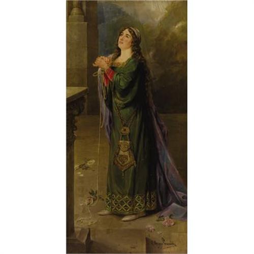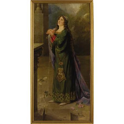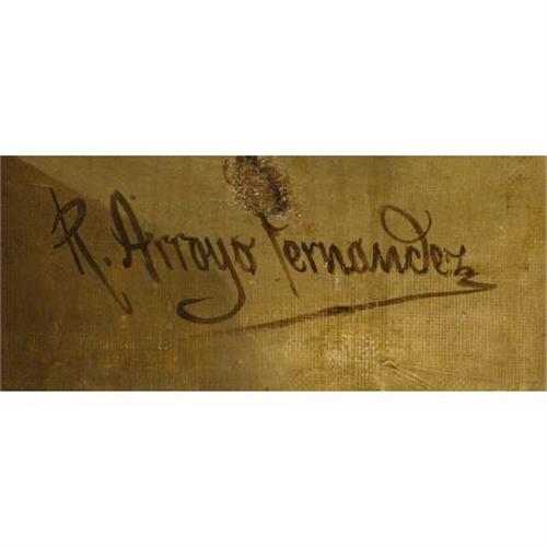 <B>RAFAEL ARROYO FERNANDEZ (Spanish, 1819-1929)</B></I><BR><I>Female Saint</B></I>, circa 1880<BR>Oil on canvas<BR>71-1/4 x 35 inches (181.0 x 88.9 cm)<BR>Signed lower right: <I>R. Arroyo Fernandez</B></I><BR> <BR>Rafael Arroyo was active both as a painter and printmaker (for the artist's exhibition history, see <I>Spanish Artists from the Fourth to the Twentieth Century. A Critical Dictionary</B></I>, vol. I, Frick Art Reference Library, New York, in association with G.K. Hall & Co., 1993, p. 81).<B>Condition Report:</B> 1-1/2 x 1-1/4 inch serious abrasion to the canvas in the lower right corner directly above the signature; scattered inpainting; frame abrasions; scattered abrasions and minor paint loss; stretcher marks.<BR><BR><b>Shipping:</b> Framed - without Glass, Large (<a target="_blank" href="http://www.heritageauctions.com/common/shipping.php">view shipping information</a>)