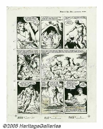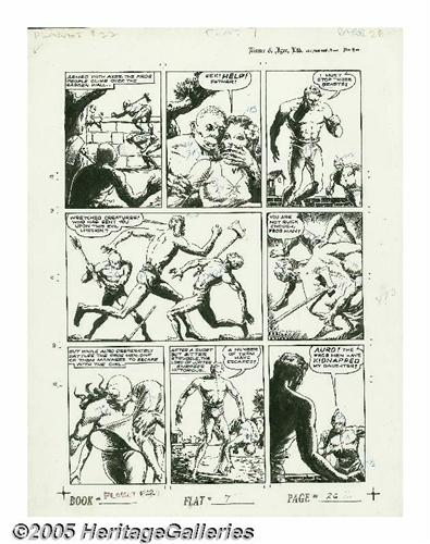<B>Rafael Astarita - Planet Comics #22 Complete 7-page Auro, Lord of Jupiter Story, "The Frog People" Original Art (Fiction House, 1943).</B></I> One of the most highly respected members of the Eisner and Iger shop, Rafael Astarita, demonstrated his dazzling brushwork in this Golden Age science fiction thriller featuring Auro, a hero cast from the Flash Gordon mold. Artist George Evans recalled Astarita's superb artwork in the comics history <B>Comics: Between the Panels</B></I>: "Astarita was the best of the artists up there at Fiction House. Raf did every picture as though he were Rembrandt, trying to create a first-class piece of work. He never got into the business of hacking it out on a formula basis." The image area of each page measures 13" x 18". Aside from some mild signs of paper aging, blue color codes written on the art (a common practice on Fiction House art), and a few missing lettering corrections, the art is in Excellent condition. This is a sensational Golden Age yarn!