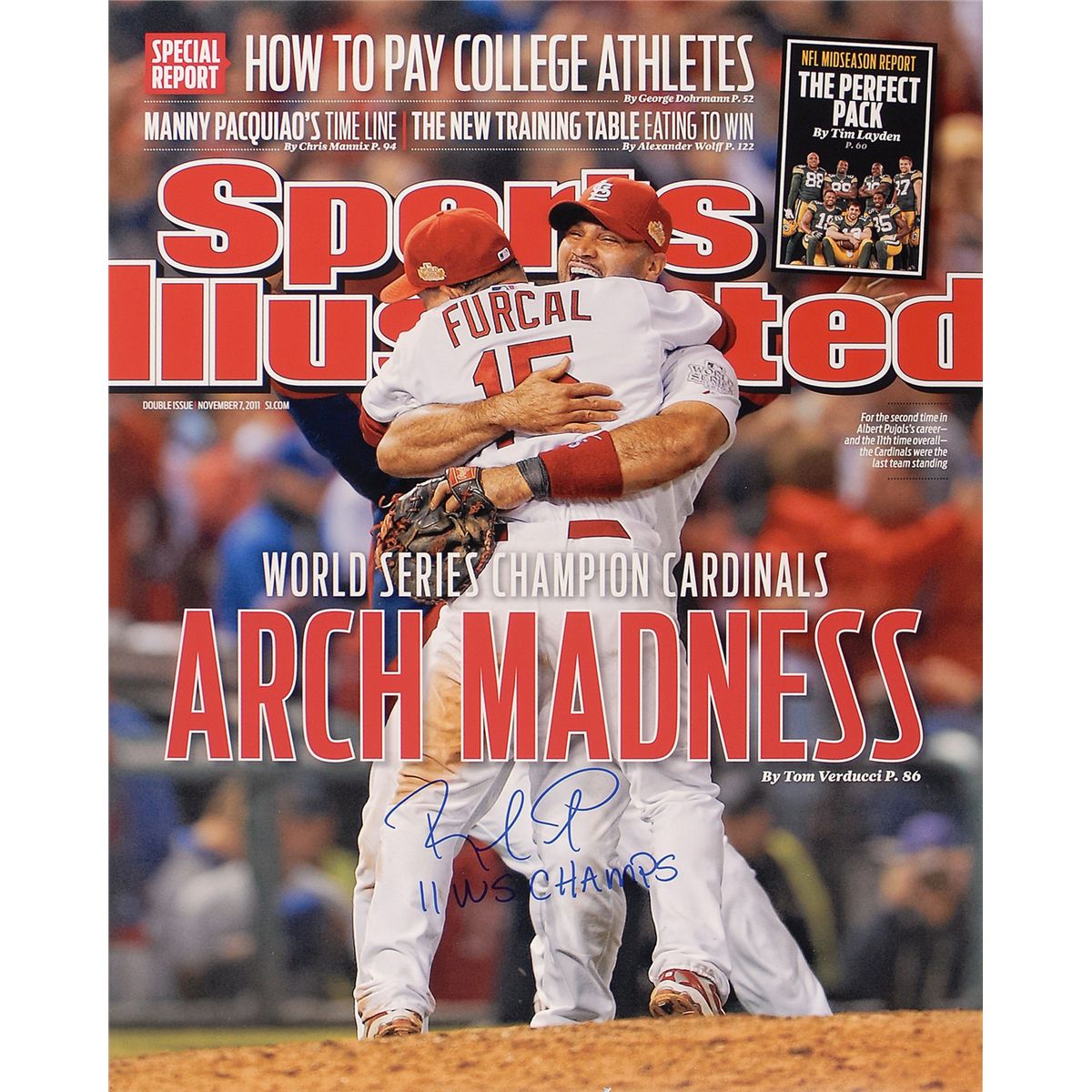 Color satin-finish 16 x 20 photo of the Sports Illustrated cover from when the St. Louis Cardinals won the World Series, signed in blue felt tip, “Rafael Furcal, 11 WS Champs.” In fine condition.