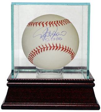 Rafael Palmeiro was named to the MLB All-Star Team four times, and won the Gold Glove three times. He is a member of the exclusive 500 home run club and the 3,000 hit club and is only the fourth player in history to be a member of both. Rafael Palmeiro has hand signed this Official Major League Baseball with 569 HRS Inscription. SI Hologram and Certificate of Authenticity from Athlon Sports. Glass Display Case shown IS included