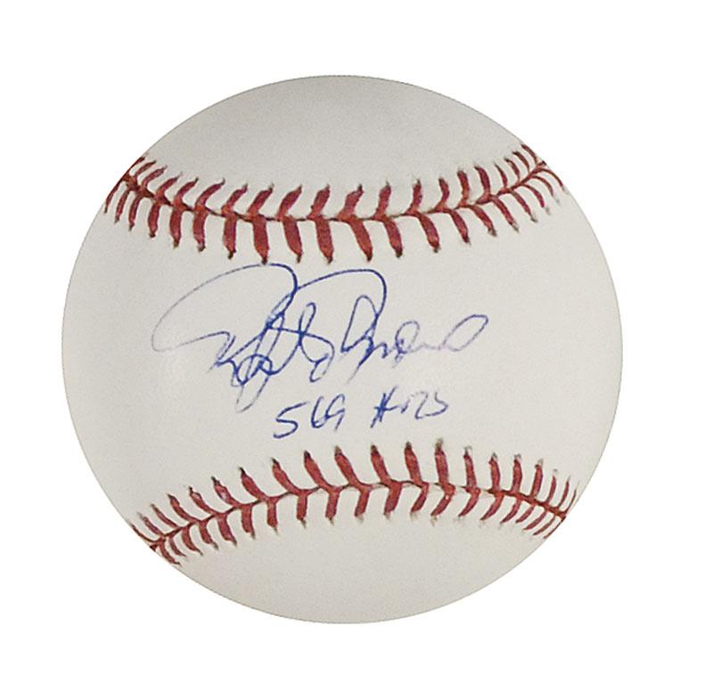 Official Rawlings Major League baseball signed in blue ballpoint on the sweet spot, “Rafael Palmeiro, 569 HRs.” In fine condition. Accompanied by a certificate of authenticity from James Spence.