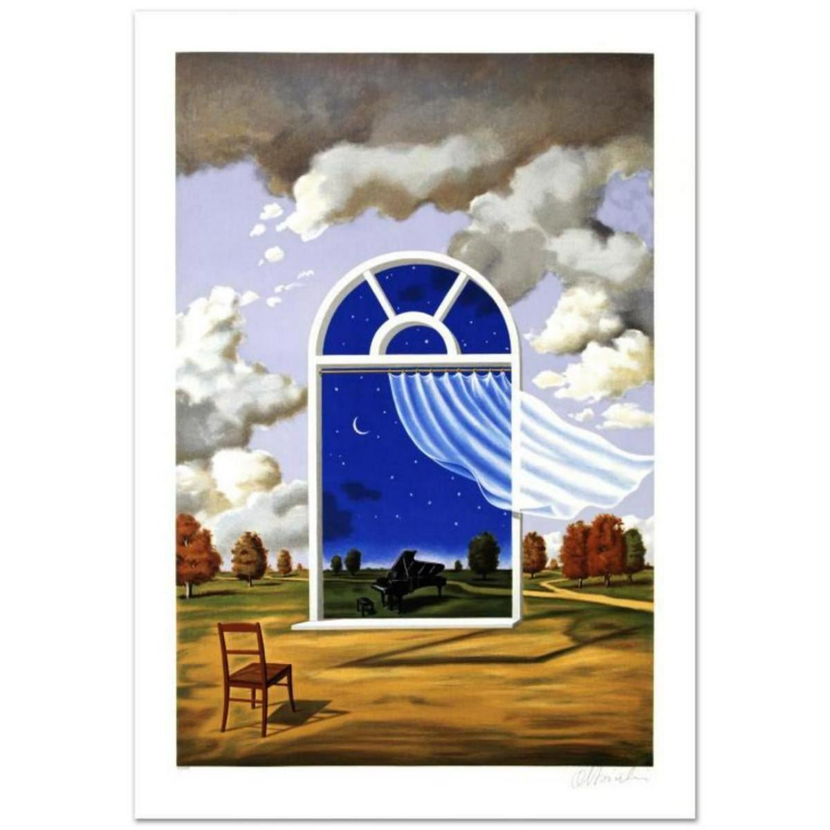 Artist: Rafal Olbinski. Medium: Hand Pulled Original Lithograph. Title: Nocturne in E Flat Major. Size (Unframed): 37.5" x 26.5". Certificate of Authenticity: Is Included. Additional: Limited edition hand pulled original lithograph on museum quality deckle-edge paper.