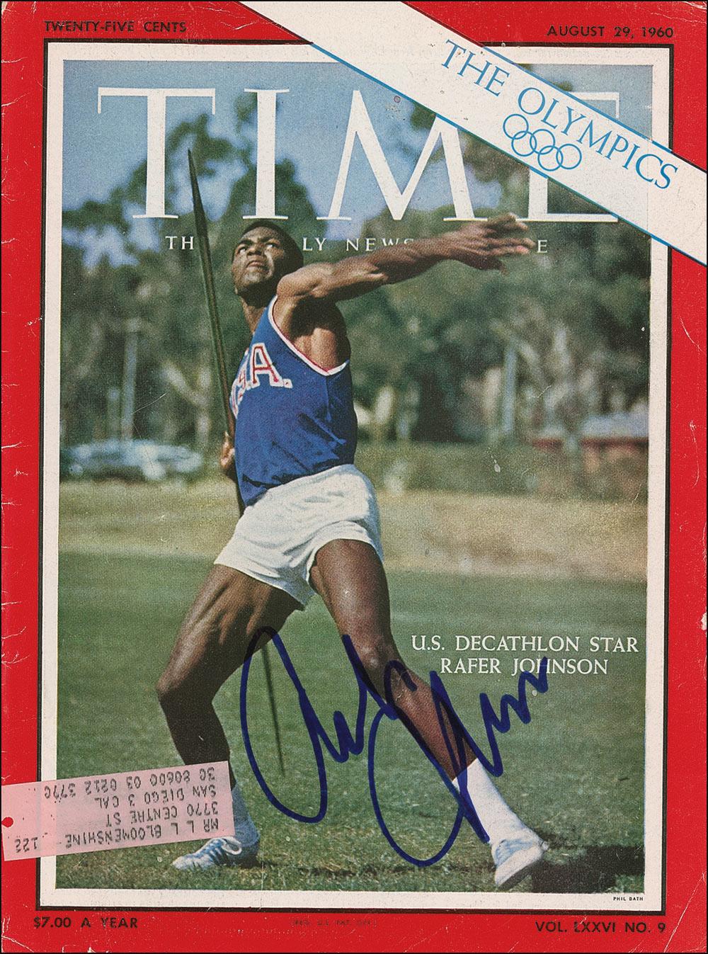 Time magazine from August 29, 1960. The front cover depicts Johnson poised to throw a javelin, and is signed in blue felt tip, “Rafer Johnson.” In very good condition, with light creasing, faint soiling, and the mailing label affixed to the bottom left corner. Pre-certified Steve Grad/PSA/DNA and RRAuction COA.
