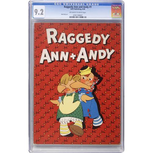 <B>Raggedy Ann and Andy #1 (Dell, 1946) CGC NM- 9.2 Off-white to white pages.</B></I> It's not a file copy, but it could've fooled us! Nicer than any known file copy! Walt Kelly art. Overstreet 2006 NM- 9.2 value = $585. CGC census 3/07: 1 in 9.2, none higher.<BR><BR><b>Shipping:</b> Comics - Slabbed (certified) (<a target="_blank" href="http://www.heritageauctions.com/common/shipping.php">view shipping information</a>)