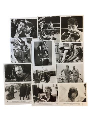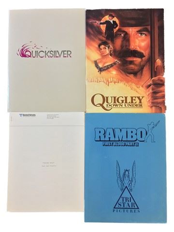 Collection of 4 press kits with black and white publicity stills included, sized mainly 8x10's, from various movie studios. (1980's-90's). From United Artists "Raging Bull" (1980) starring Robert De Niro as Jake La Motta, Martin Scorsese as Barbizon, and Cathy Moriaty as Vickie La Motta, includes 12 stills. From Columbia Pictures "Quick Silver" (1986) starring Kevin Bacon as Jack Casey, Jami Gertz as Terri, and Lawrence Fishburne as Voodoo, includes 4 stills. From Pathe Entertainment "Quigley Down Under" (1990) starring Tom Selleck as Mathew Quigley, Lauren San Giacomo as Crazy Cora, and Alan Rickman as Elliot Martson, includes 8 stills. From Tri Star Pictures "Rambo First Blood ll" (1982) starring Sylvester Stallone as John Rambo, Richard Crenna as Sam Trautman, and Brian Dennehy as Hope Sheriff, includes 11 stills.