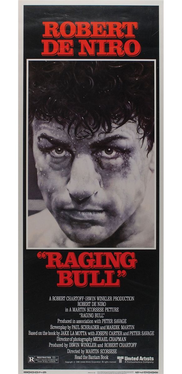 Original color 14 x 36 insert for Martin Scorcese’s 1980 Academy award-winning film Raging Bull, starring Robert DeNiro, Cathy Moriarty, and Joe Pesci. In fine condition, with none of the folding creases that are typically seen on such inserts. An excellent example of this iconic image.