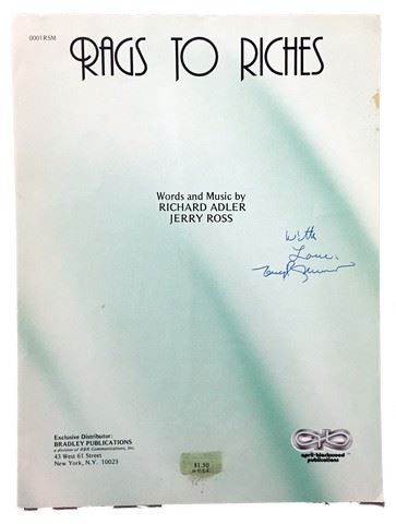 Signed copy of sheet music for "Rags to Riches", words and music by Richard Adler and Jerry Ross.