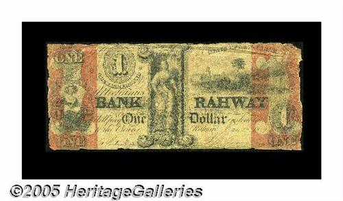 <B>Rahway, NJ- Bank of Rahway</B></I> $1 Jan. 1, 1859 UNL Wait UNL<BR>This variety, with red end panels, is unlisted in both the Haxby and Wait references. The design is identical to Haxby G8, which lacks the red end panels. Well circulated but intact <B>Very Good.</B></I>