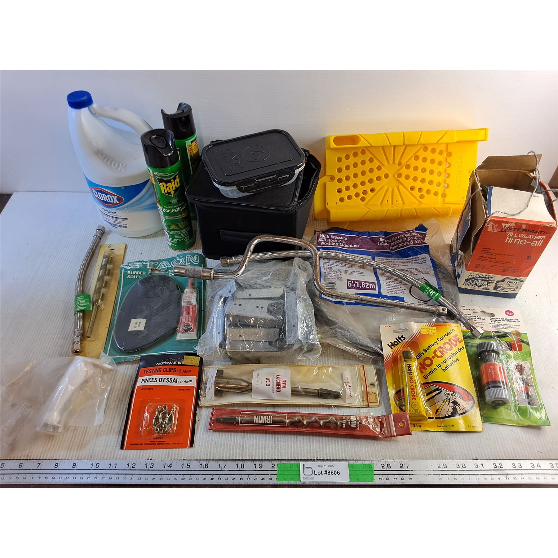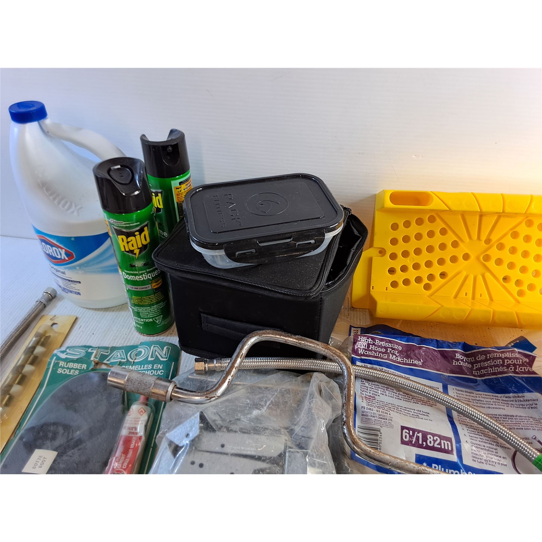 Raid Spray, Bleach, Miter Box, Pack Fitness Food Containers, Drill Bits, Rubber Soles, Misc