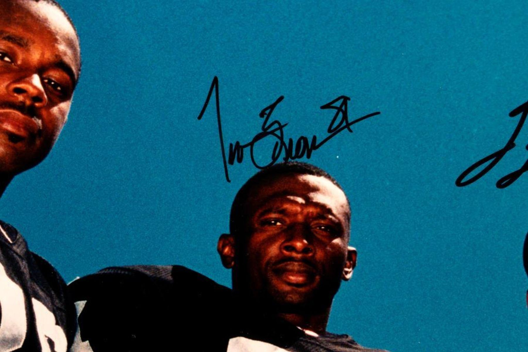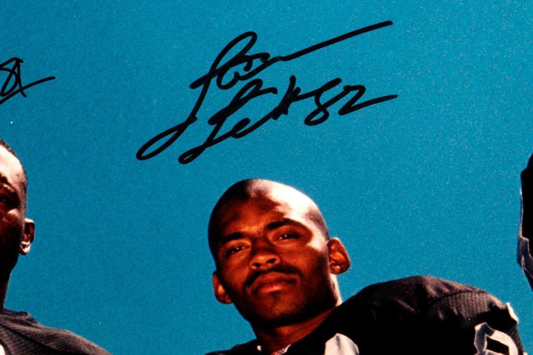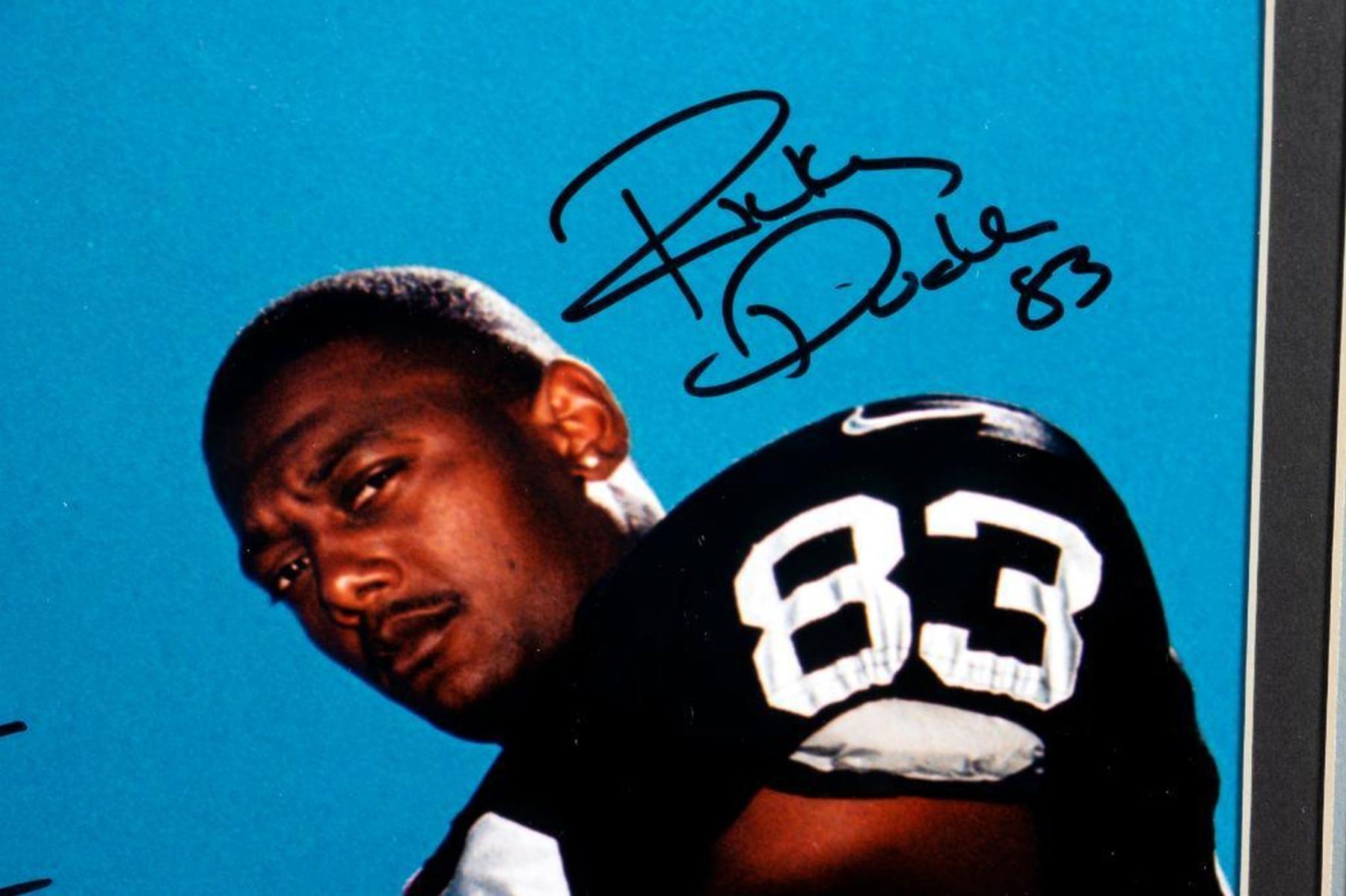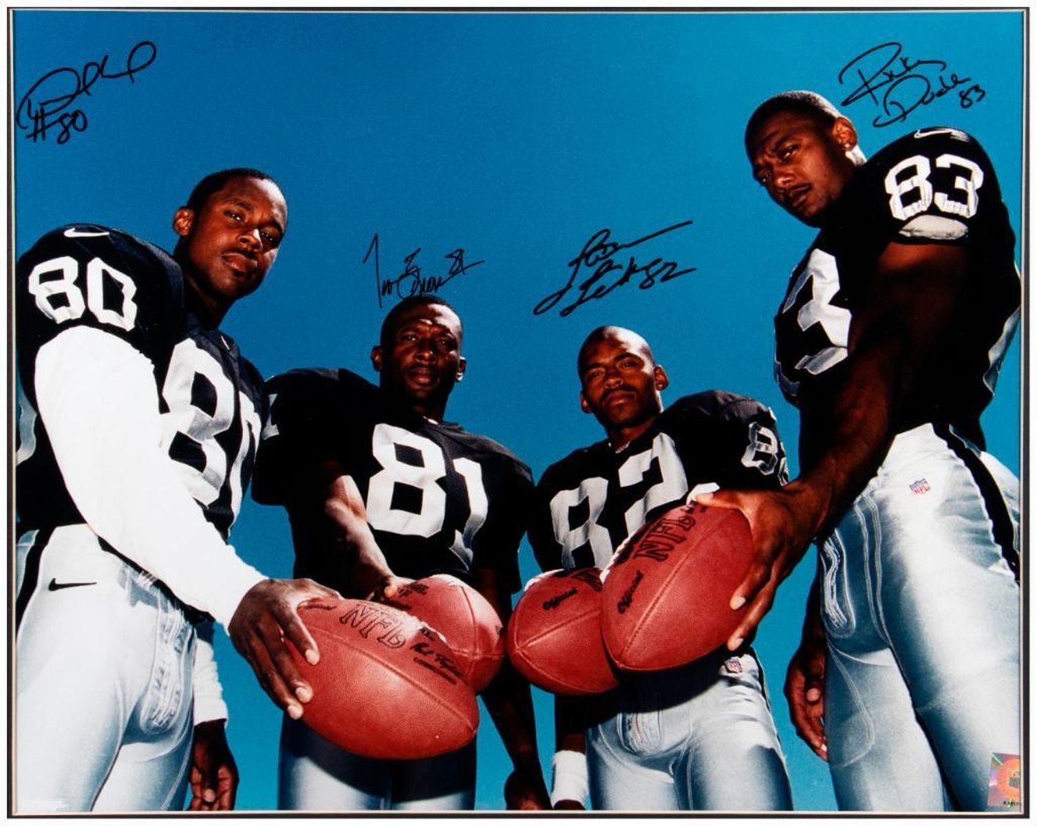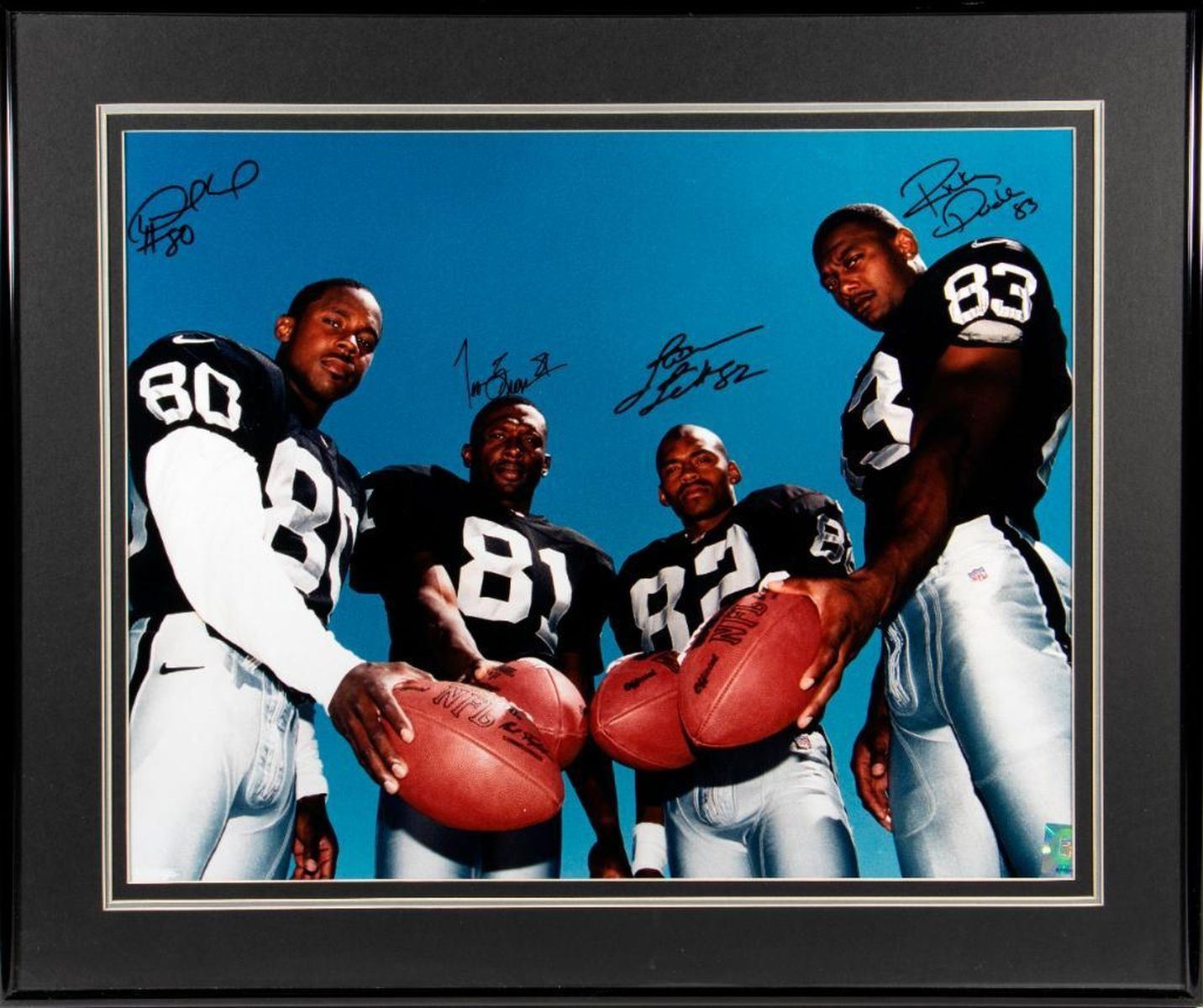 Raiders Framed Autographed Photograph. Ricky Dudley, James Jet, Tim Brown. Frame: 20 1/2 x 24 1/2 inches. Depth: 1 inch.