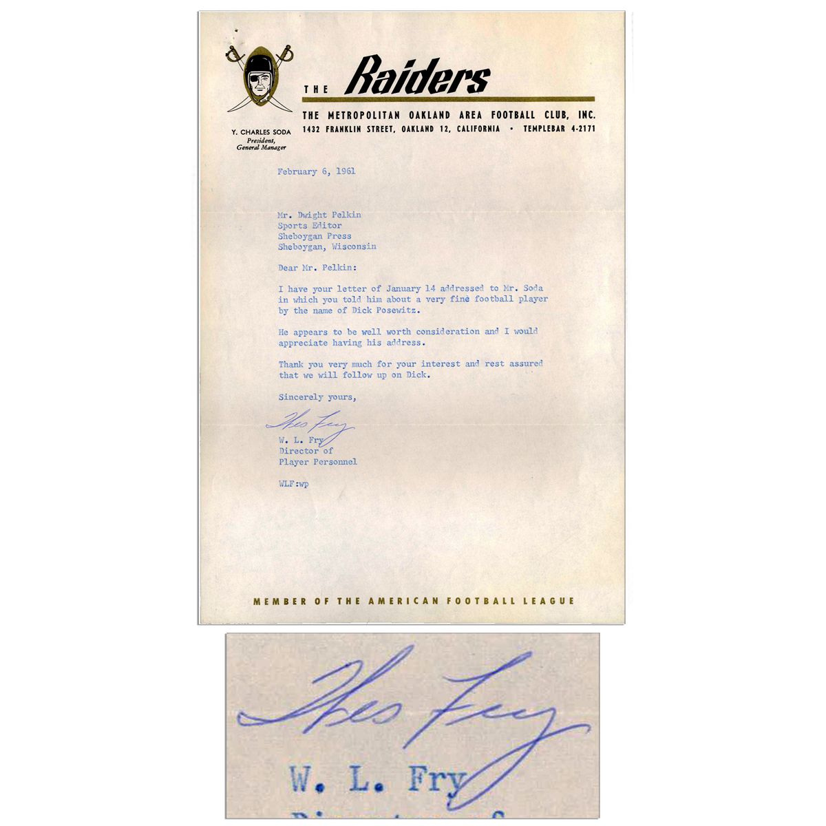 Oakland Raiders Wesley ''Cowboy'' Fry typed letter signed, dated 6 February 1961, on Raiders letterhead. He signs, ''Wes Fry'' above his ''Director of Player Personnel'' title. Fry began with the Raiders in 1960, the first year of the team. The letter on behalf of General Manager Charles Soda requests the address of a football player, Dick Posewitz; Fry would replace Soda as General Manager. Minor toning to 7.25'' x 10.5'' letter, else near fine.
