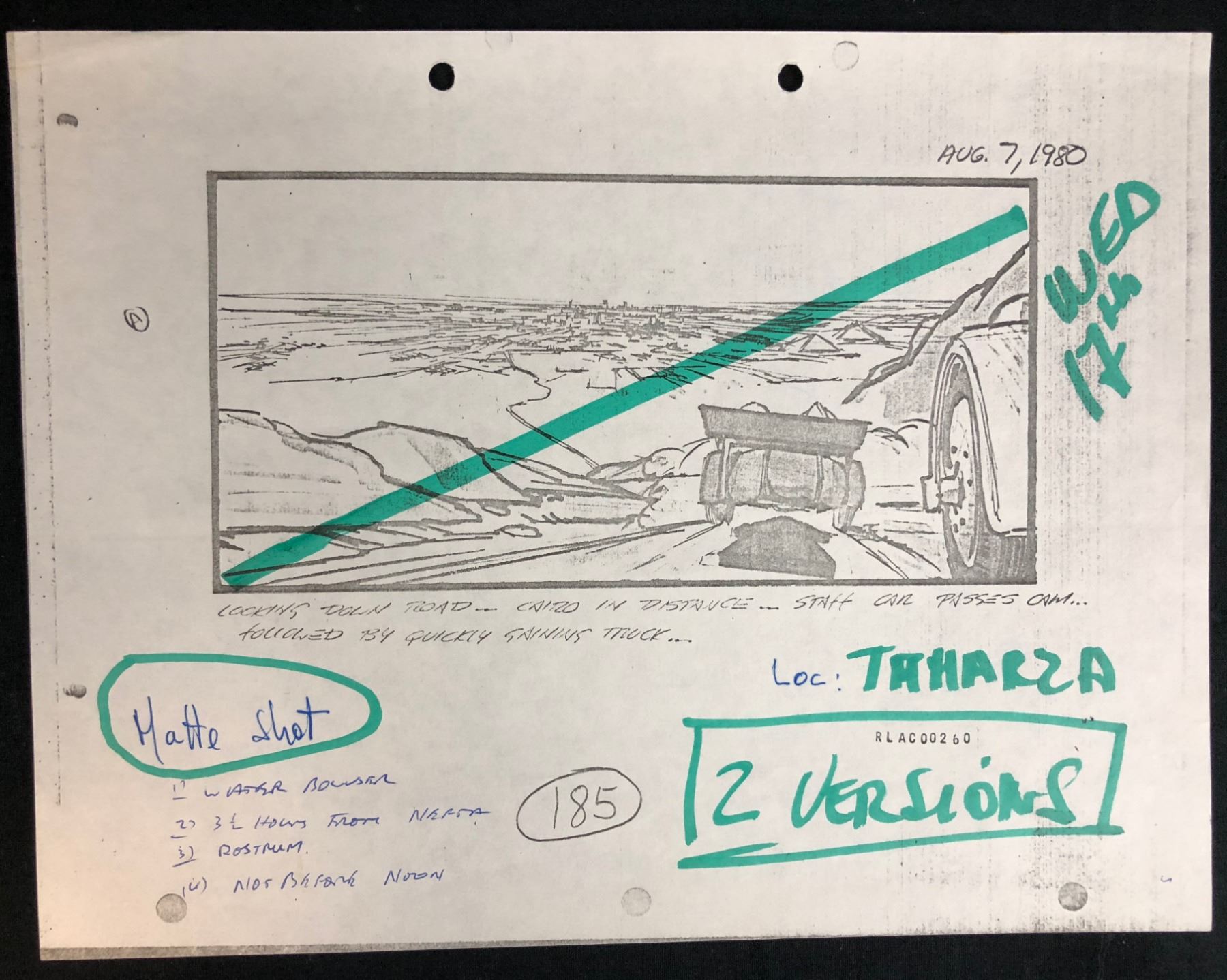 The date of August 7th 1980 is written on the front along with numerous other hand written notes and depicts the famous truck chase scene. Originally from the collection of second unit assistant director Carlos Gil.