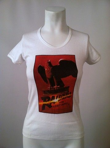 From the early days of ILM, a rare "Raiders of the Lost Ark (1981)" cast and crew t-shirt. This was created before there was any actual footage and while the concept was still growing in the minds and talents of Spielberg, Kasdan and Lucas. It comes from the personal collection of ILM legendary Special Effects Artist Kim Knowlton who worked on the movie. The shirt is a woman's Hanes French cut short sleeve white shirt and comes with a Letter Of Provenience from Ms. Knowlton. (Size M).
