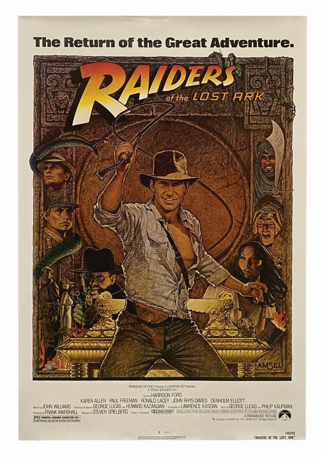 (Paramount, 1982) A vintage Raiders of the Lost Ark 1982 re-release one sheet poster. An unexpected smash hit upon its debut in 1981, the first entry in the Indiana Jones franchise remained in continuous release at some theaters until this updated advertising material was issued for the summer blockbuster season the following year. The poster features heroic art by Richard Amsel of Indy (Harrison Ford) cracking is signature bullwhip. Measuring 41"x27", the item is in very good condition with minor edge wear.