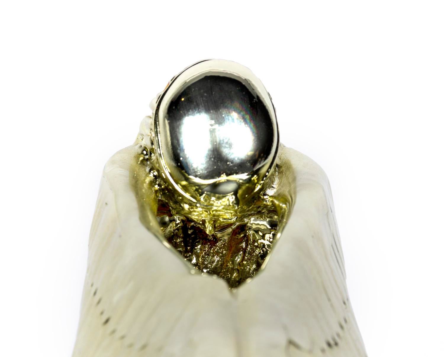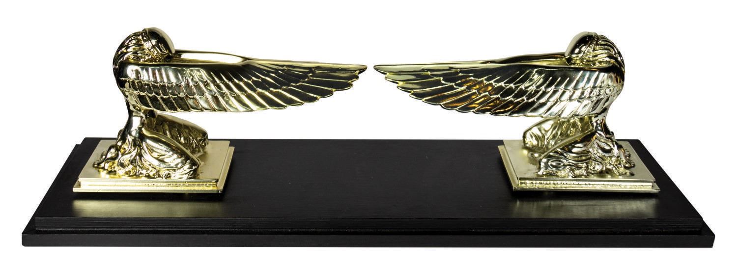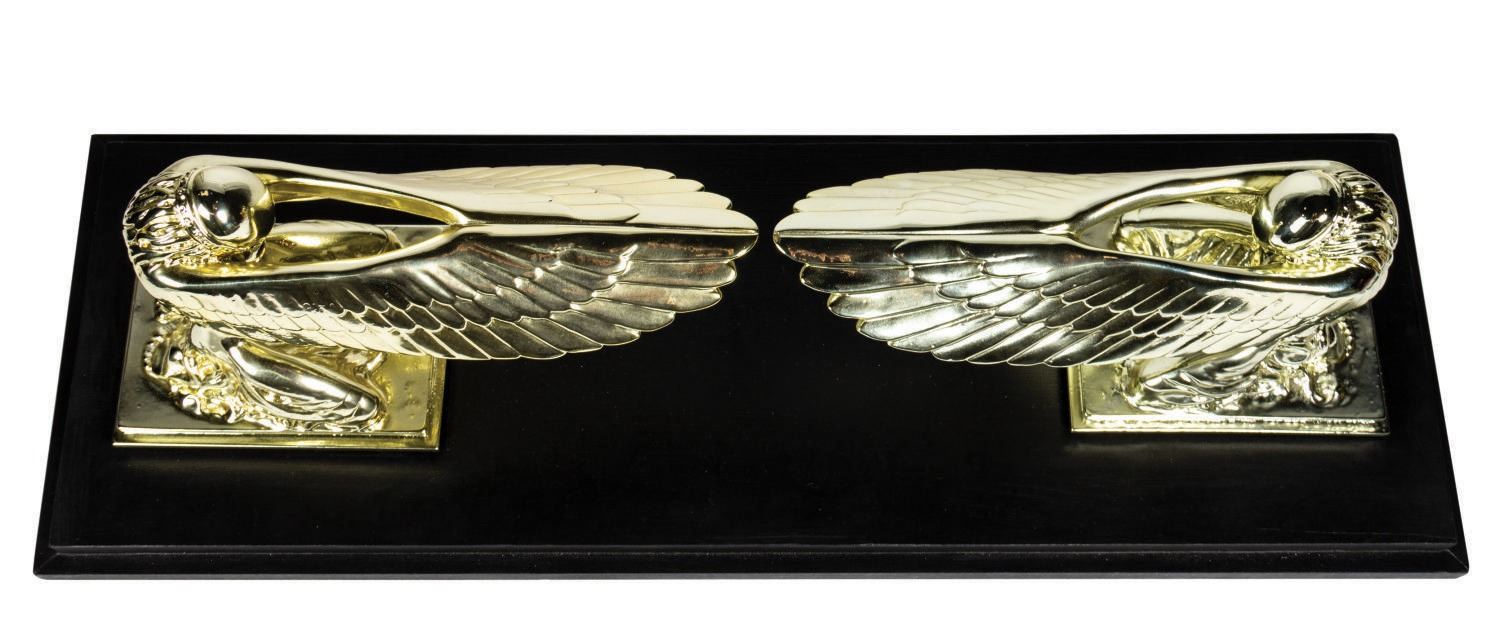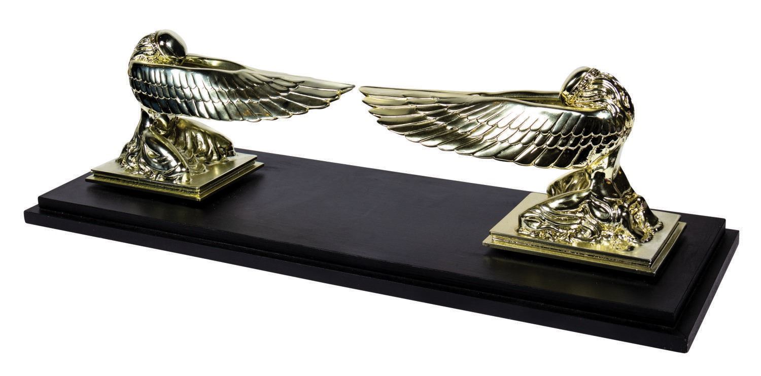 (Paramount, 1981) A stunning pair of replica angels based on the similar props used on the Ark of the Covenant in Raiders of the Lost Ark. Arguably one of the most recognizable props in film, the Ark of the Covenant features two golden kneeling angels atop the lid. These replicas are cast in resin with a metallic gold plating. Both figures have three nobs at their base with holes for mounting, and have been attached to a wooden base. Measuring 12"x36.5" and approximately 10" tall on their custom display base, the angels are in very good condition with minor surface wear.
