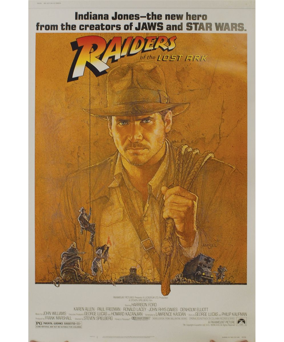 Uncommon large color 40 x 60 poster for the 1981 Indiana Jones film Raiders of the Lost Ark starring Harrison Ford. Poster features a massive image of Jones with his bullwhip slung over his shoulder. Rolled and in fine condition.