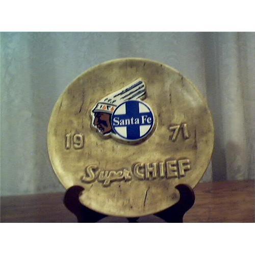 This is a nice decorative plate advertising the Santa Fe R. R. and the Super Chief. The plate is dated 1971 and has a head of the Super Chief. The plate was made by Chemin De Fer Ind. Of Conifer, Col. It is in perfect condition no chips no crazing and paint all there.