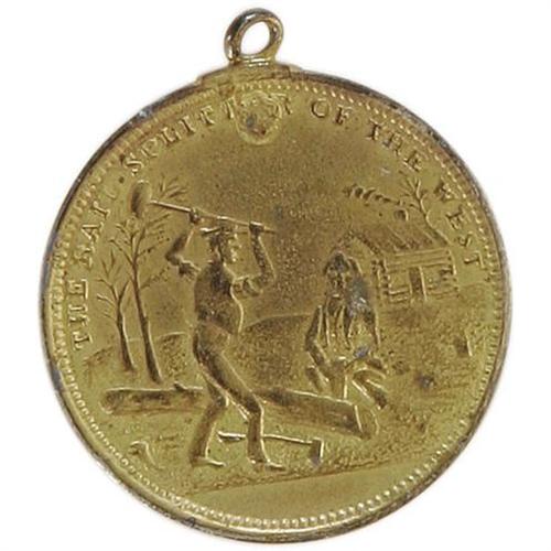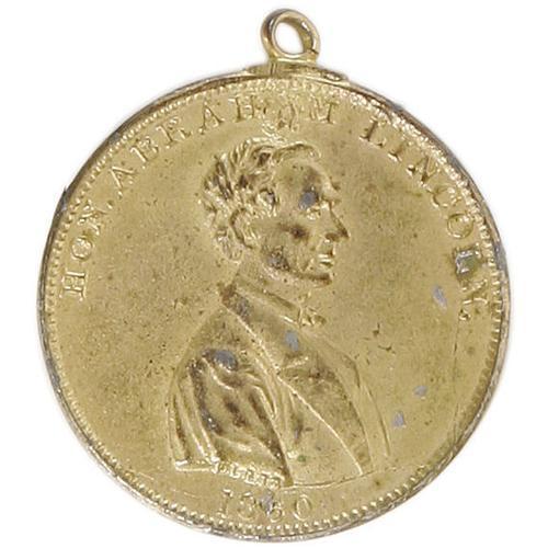 <B>Rail Splitter Token</B></I> This example is in brass, measures 28mm, with the addition of a soldered loop affixed at top so it can be worn as a charm or good-luck keepsake. Fine detail overall, a better example.<BR><BR><b>Shipping:</b> Miscellaneous Collectibles, Smal (<a target="_blank" href="http://www.heritageauctions.com/common/shipping.php">view shipping information</a>) <BR><BR><B>Importan