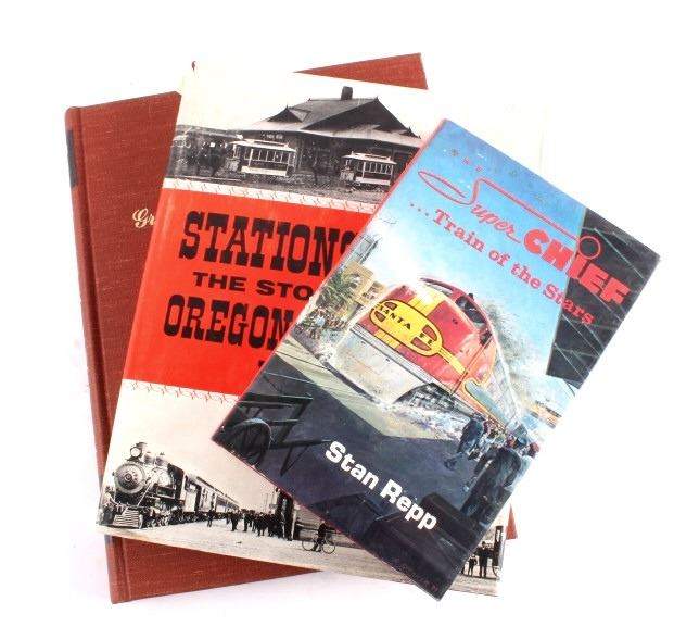 This is a collection of three railroad books. Included is "Super Chief... Train of the Stars" by Stan Repp, 1st edition 1980, with dust jacket; "Stations West, The Story of the Oregon Railways" by Edwin D. Culp, 1st edition 1972, with dust jacket; and "Great Railroad Photographs" by Lucius Beebe& Charles Clegg, 1st edition 1964. All three books are in good overall condition. The largest measures 9.25" x 12.25".