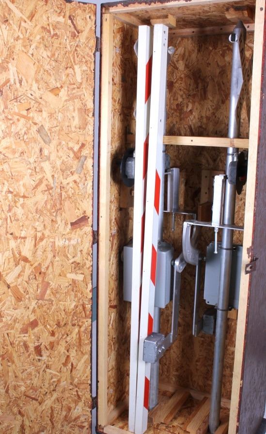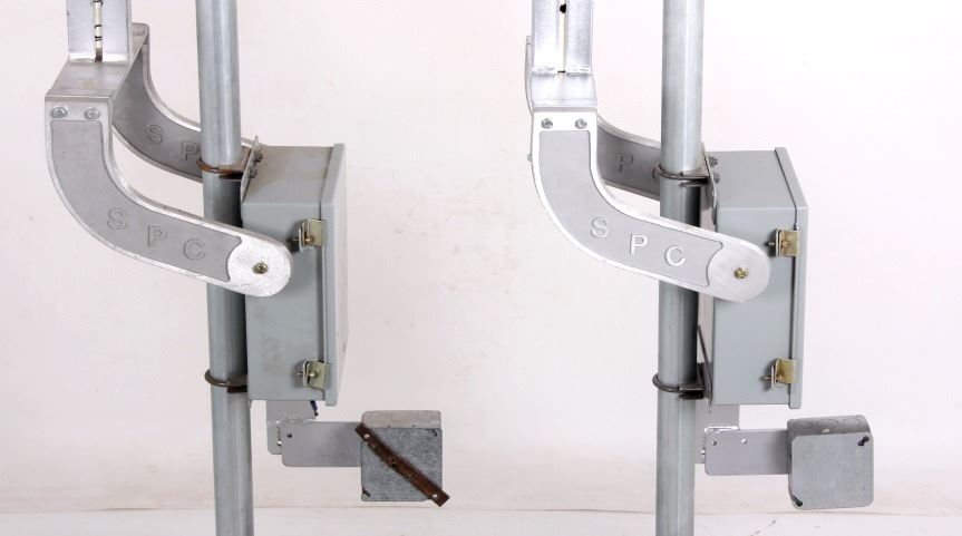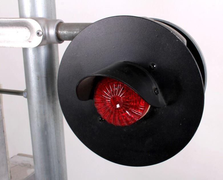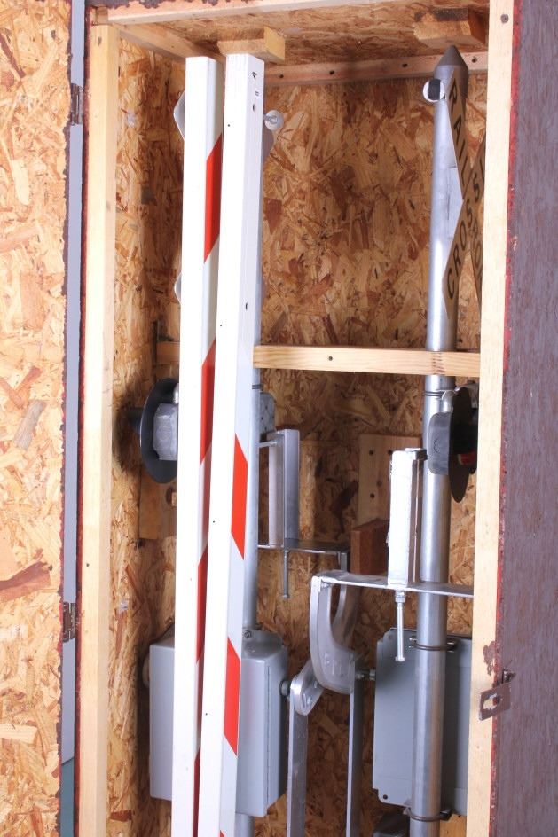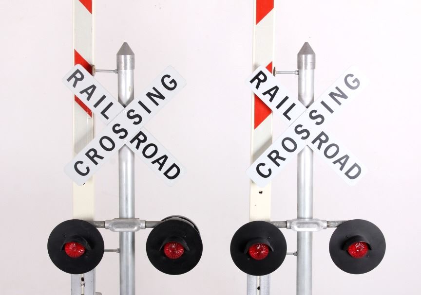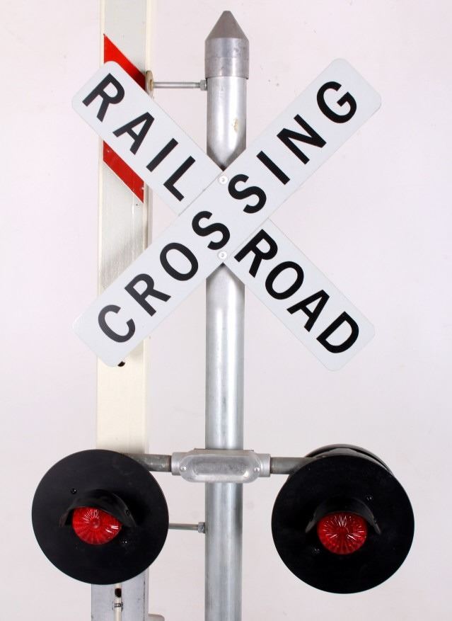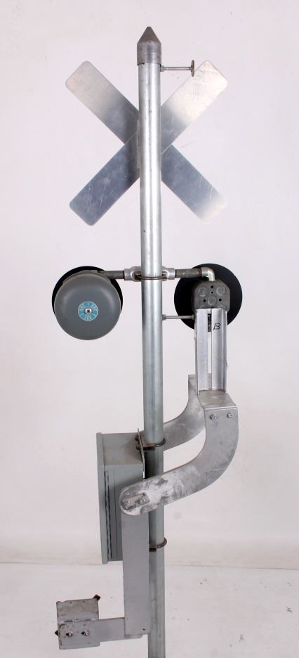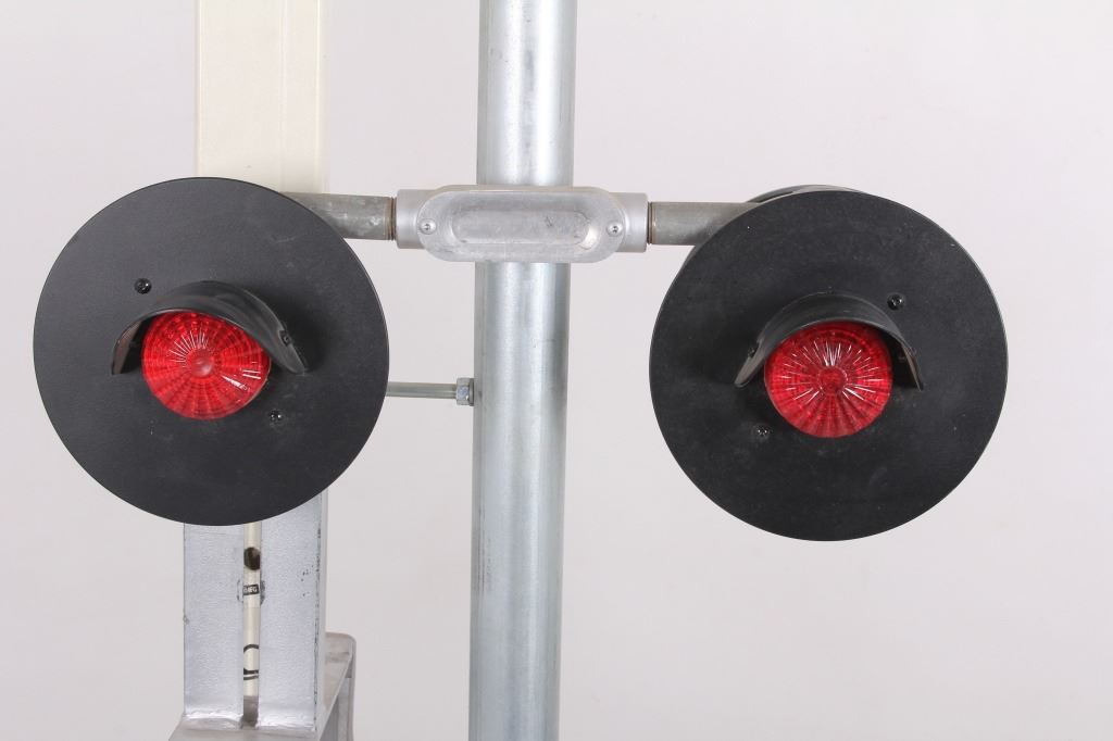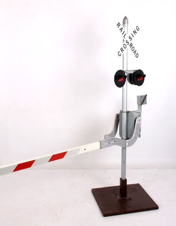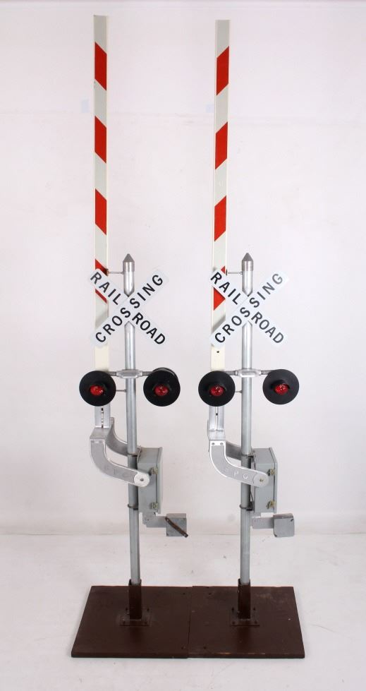 This is a pair of 7.5" gauge railroad crossing signals. They came from the James Edgerley Collection of the OR&W Railroad in Bozeman, Montana. The signals are New Old Stock and have never been used. They come in the original shipping and storage container. The crossings are marked "SPC". Each crossing is equipped with flashing lights and motorized arm. The railroad crossing signals are in very good condition. Each one comes with a custom made base. The crossings measure